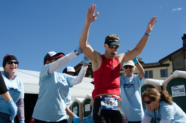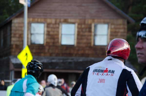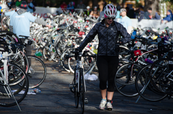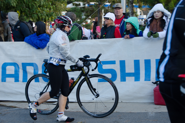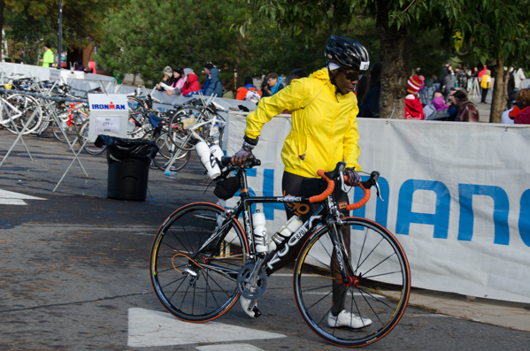 Beim Triathlon gilt: Wer morgens seinen Einteiler angezogen hat, kommt bis abends nicht mehr aus ihm heraus – aber nicht hier: Hier und heute ist alles aufwendiger und die Zeit läuft und läuft. Meine eiskalten, steifen Finger sind keines Gefühls mehr fähig. Noch immer kraulen viele gleichförmig durch das kalte Gewässer. Nicht wenige unter ihnen sind, wegen der Kälte bereits hier auf der Strecke geblieben. Bis dann endlich meine Schuhplatten in die Pedale klicken sind unglaubliche 18 Minuten (!) vergangen. Zum Vergleich, in den vergangenen Jahren habe ich in Frankfurt in der ersten Wechselzone immer nur knapp 6 Minuten gebraucht.