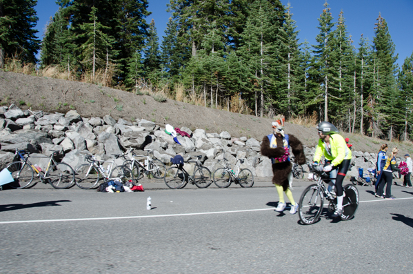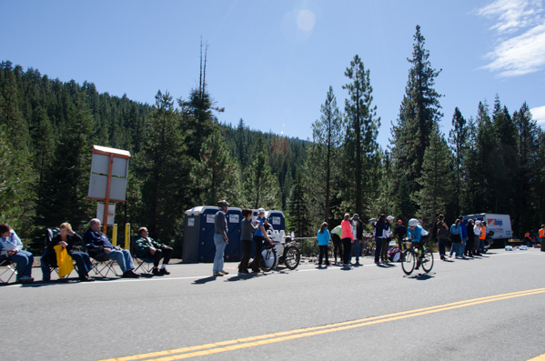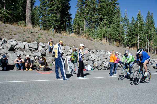 Am zweiten Pass wirft es mich im wahrsten Sinn des Wortes dann fast doch noch aus dem Sattel und zwar vor Staunen. Vor mir arbeitet sich ein durchtrainiert aussehender Triathlet mit kleinem Schädel und großen Aerohelm auf seiner Triathlon-Rennmaschine mit Scheibenrad den Berg hoch und lässt sich kampflos von mir überholen. Dann (kreisch!!!) befinde ich mich am Fuß des 7209 feet (2.197 Meter über N.N.) hohen Brockway Summit. Dort oben hat es gestern noch geschneit! Mein Wille kann mit dem Aufstieg fertig werden, aber wissen das auch meine Beine?