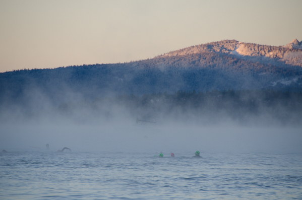 Das erste Sonnenlicht trifft auf das Weiß des Nachtfrosts. Es vergoldet augenscheinlich die noch vor mir liegenden Bojen – zumindest einen Augenblick lang. Der Rücken wird leicht erwärmt von der Sonne und ich sehe, wie das Wasser unter mir tiefer und ich spüre, wie der See kälter wird. Bei diesem Unterwasserfernblick dürfte jeder Goldfisch im Glas verrückt werden. Nicht hetzen, sich mitziehen lassen wie ein Stück Treibholz - das hatte ich mir vorgenommen. Dunst steigt aus dem Wasser empor, nicht nur der Wind kräuselt die Wasseroberfläche. Unter Wasser wirken die Triathleten in ihren schwarzen Neoprenanzügen wie ein aufgeschreckter Fischschwarm. Über Wasser schlagen die muskulösen Ausdauerenthusiasten mit ihren starken Arm- und Beinschlägen alles nieder – auch Treibholz! Mutig versuche ich mich so schnell als möglich in das Gewimmel der zuckenden Meerestiere einzufügen und um sozusagen in deren Kielwasser zügig und trotzdem sicher voranzukommen. Immer wieder hebe ich den Kopf und peile ich die Silhouette der nächsten Boje an, die allmählich näher kommt und bald habe ich die Hälfte der Strecke geschafft.