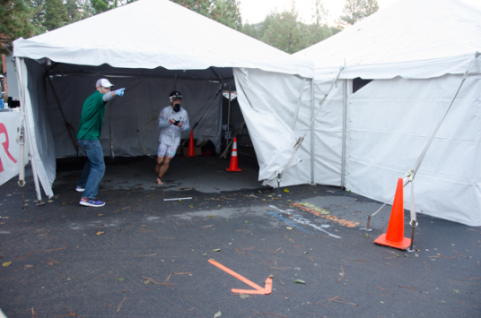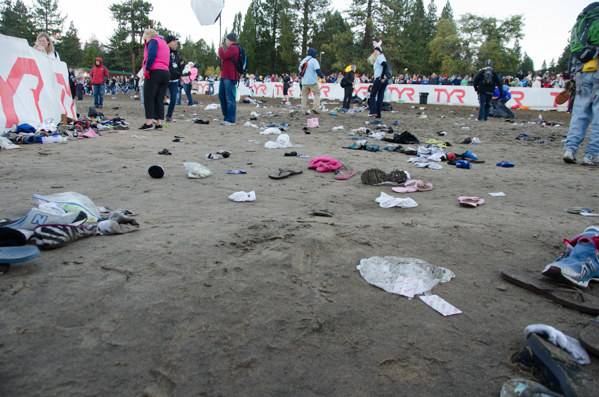 Völlig fassungslos betrachte ich das Wuseln und Treiben und versuche drei Schichten eng anliegende Kleidungsstücke über den feuchten Körper zu ziehen. Schon zieht und zerrt es wieder an mir. Die Helferinnen bemühen sich, jedem möglichst schnell in sein Trikot zu helfen. Die Kleidung ist kalt und klamm. Sie lag die ganze Nacht auf dem regennassen Boden, die Schnur daran ist über Nacht vereist. Zum Glück habe ich in die Tüte noch eine Tüte gesteckt und so hat meine Kleidung die Nacht trocken überstanden.