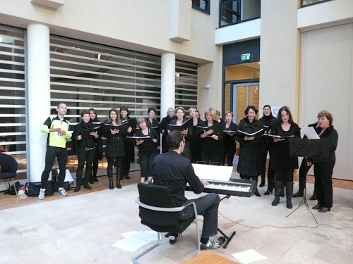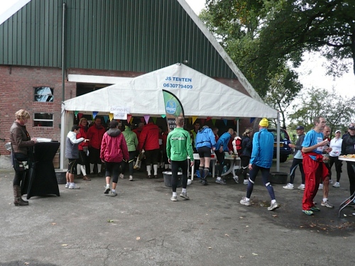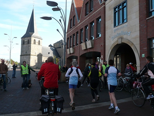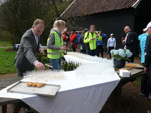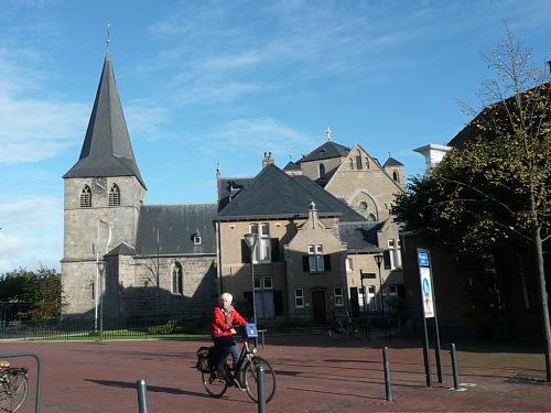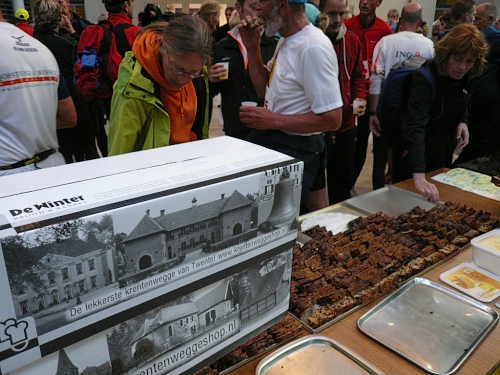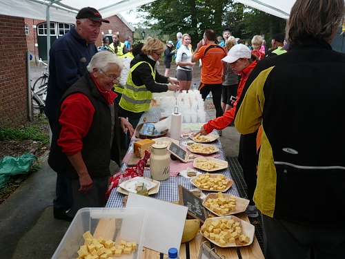 Denekamp gehört zur Gemeinde Dinkelland. Die Bevölkerung lebt vom Tourismus und von der Viehhaltung. Viele Einwohner arbeiten auch im benachbarten Oldenzaal. Wir laufen durch Wohnstraßen und kommen direkt auf die Nikolauskirche zu. Der Utrechter Bischof hat diese Kirche 1527 eingeweiht. Vor dem Gemeindehaus werden wir von einem Chor unterhalten. Aber das ist nicht alles, denn wir sind nach nur zwei gelaufenen Kilometern am nächsten Verpflegungspunkt mit dem Buffet der Bäckerei Winter. Das Rosinenbrot ist einmali. Ich komme einfach nicht drum zweimal zuzugreifen. Zu trinken gibt es Orangen- oder Grapefruitsaft und Wasser.