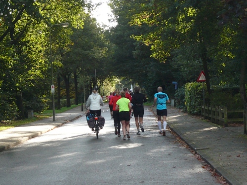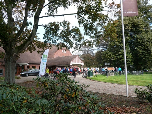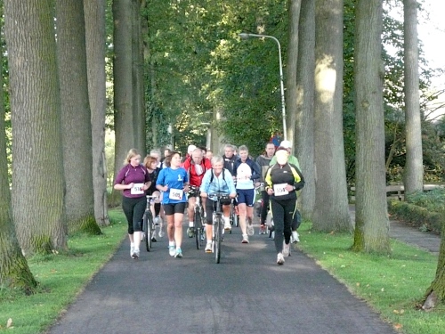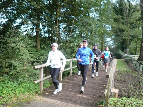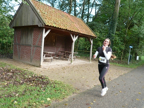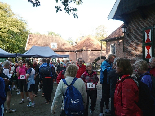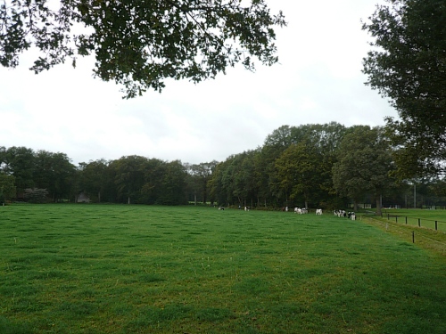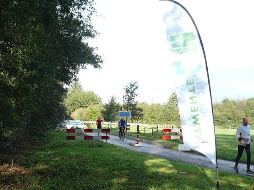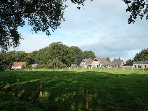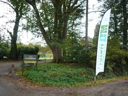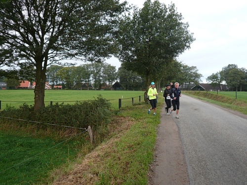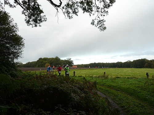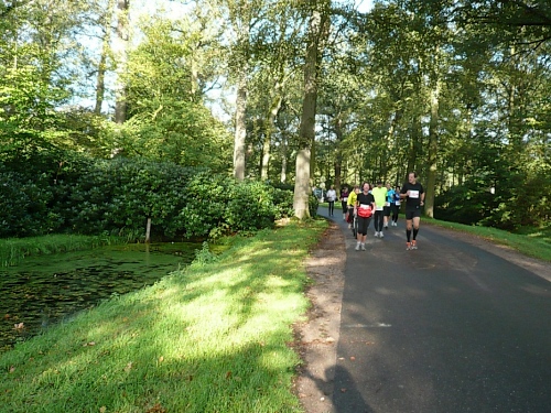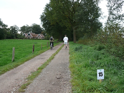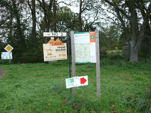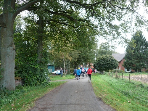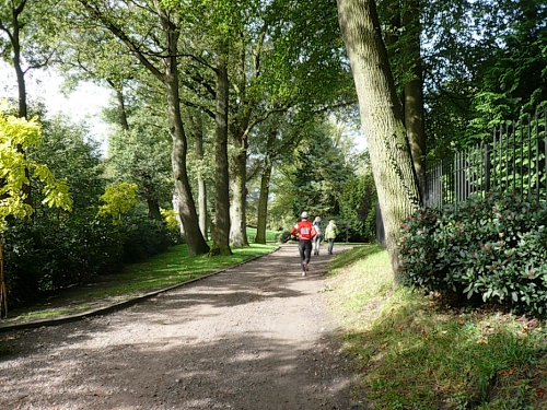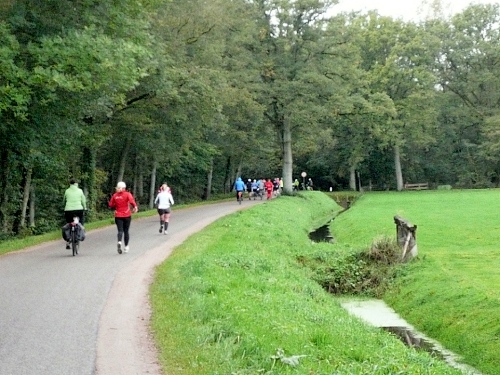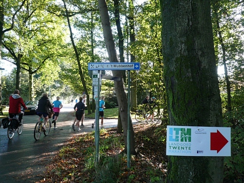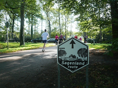 Wir laufen ein Stück um das Gebäude und den Park und folgen der Sagenland-Route. Die Sonne scheint herrlich und es ist wirklich eine wunderschöne Gegend hier. Der Veranstalter vom LTM (Landgoed Twente Marathon) hat die Strecke sehr gut gekennzeichnet. Überall, wo man abbiegen muss, sind Schilder mit dicken roten Pfeilen. Wirklich vorbildlich. Nach knapp zwei Kilometern kommen wir an den Rand der Gemeinde Denekamp.