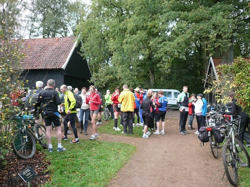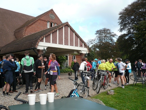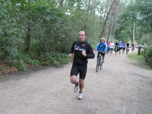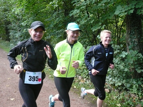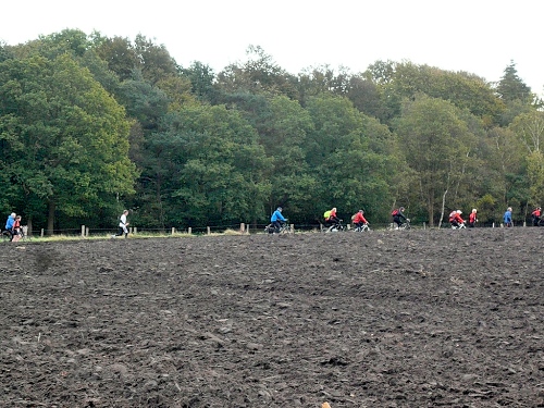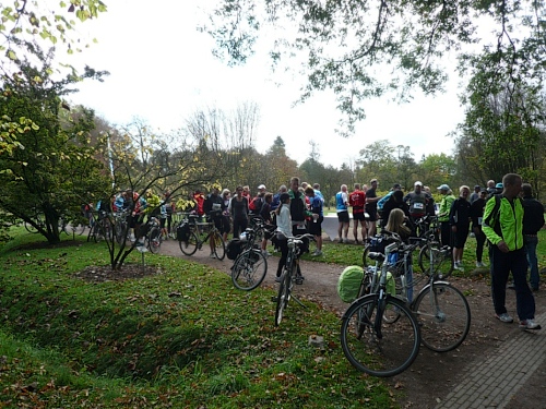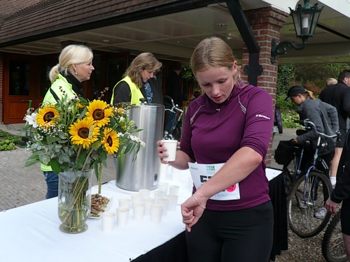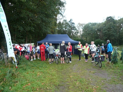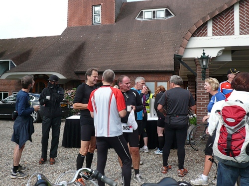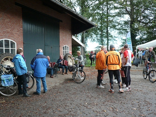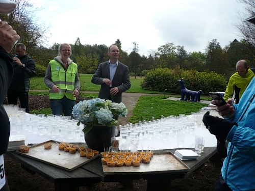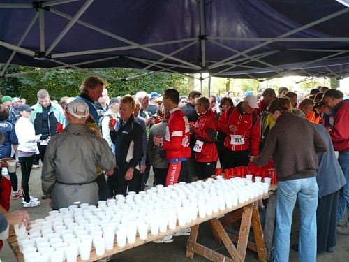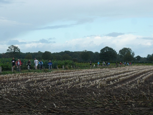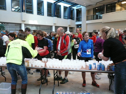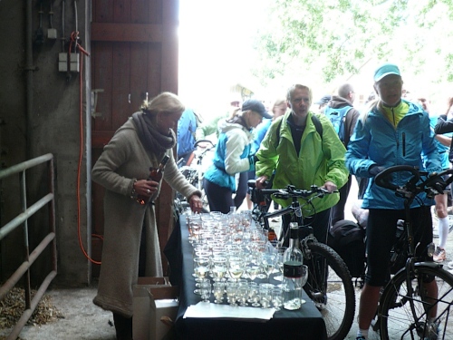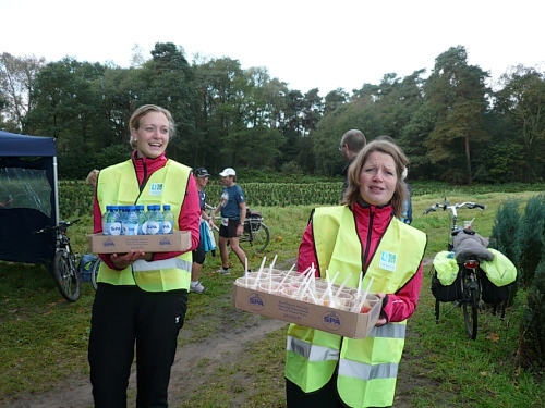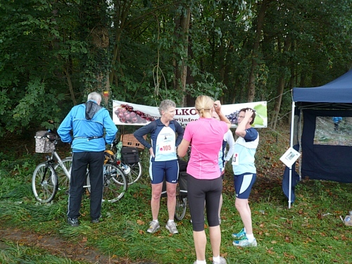 Ea es den ganzen Morgen geregnet hat, ist es auf den Wiesenwegen manchmal ziemlich schmierig und rutschig. Wir kommen an einen Waldrand und es heißt mal wieder Pause machen. Hier bei km 10,5 erwarten uns junge Damen mit Wasser und Fruchtcocktails. Weiter geht’s auf schmalem Pfad, die Biker müssen ihre Räder schieben es geht nur Gänsemarsch vorwärts. Überholen geht nicht, macht aber auch nichts, hier hat jeder Zeit, keiner ist am Drängeln oder meckern.