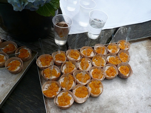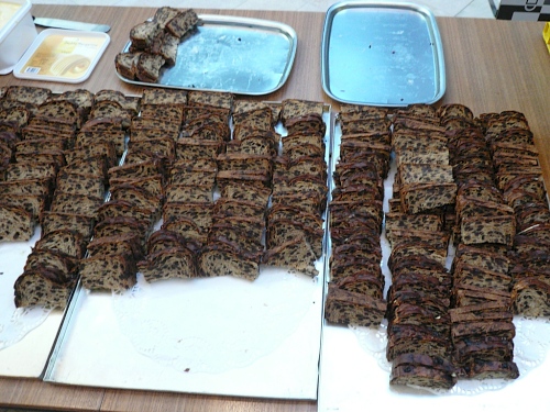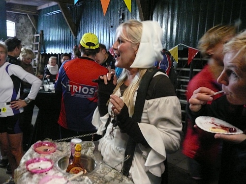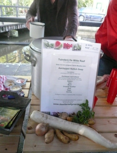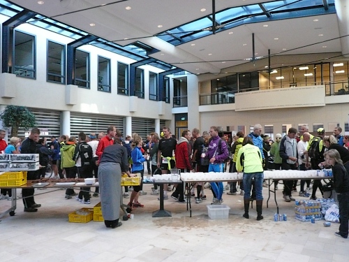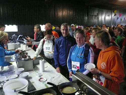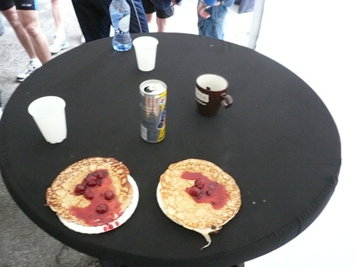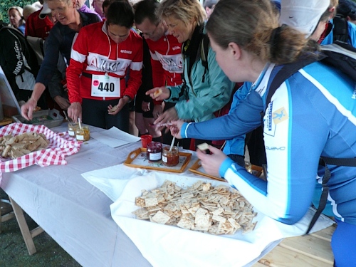 Das ist das Stichwort. Die erste Versorgungsstelle wartet auf uns - oder besser gesagt, das erste Restaurant. Es gibt einen Riesenstau, denn alle wollen die Kartoffel-Rettichsuppe probieren oder einen Keks mit leckerer Marmelade ergattern. Auch ich muss das natürlich probieren. Wasser gibt es übrigens auch. So nach mehreren Minuten Rast geht es langsam weiter.