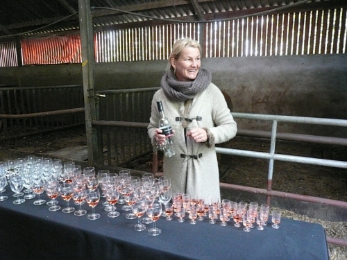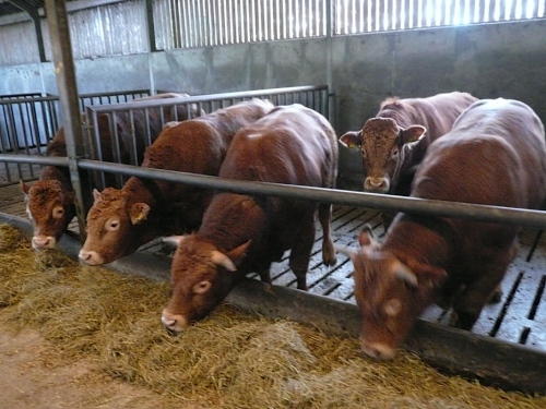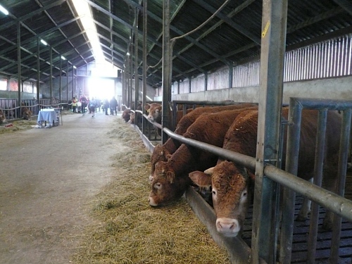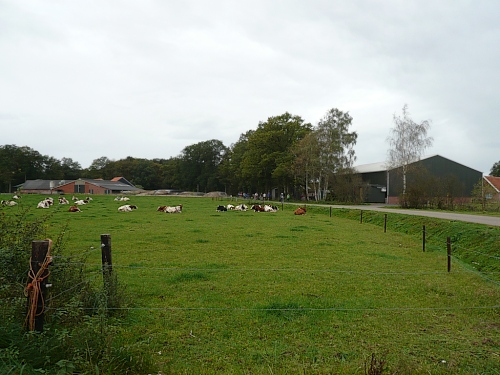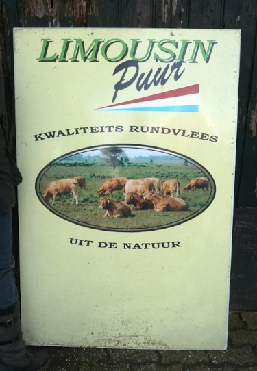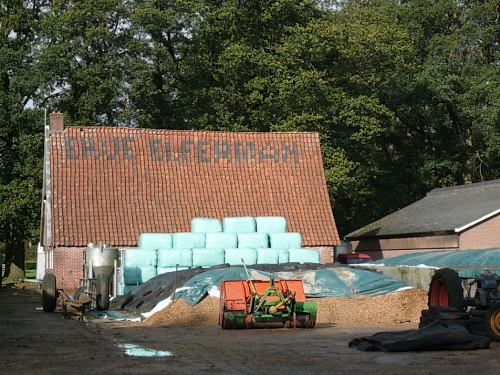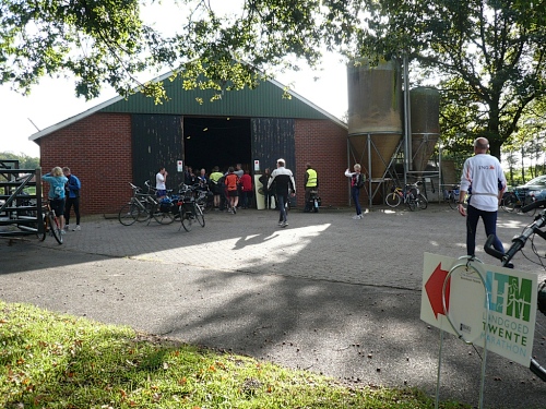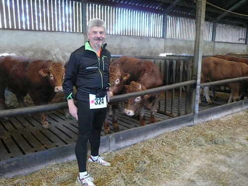 Bei km 8,5 kommen auf den Bauernhof Erve Elferman. Wir machen Halt am Stall der verfressenen Limousin-Rinder. Für uns hält man Rot- und Weißwein bereit. Muss ich auch probieren, lecker. Wir verlassen den Stall am anderen Ende und setzen unseren Lauf fort. Wir sind wieder im Grünen und laufen an einsamen schönen Häusern und Gehöften vorbei.