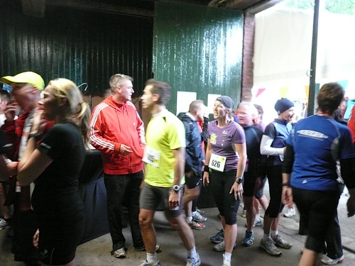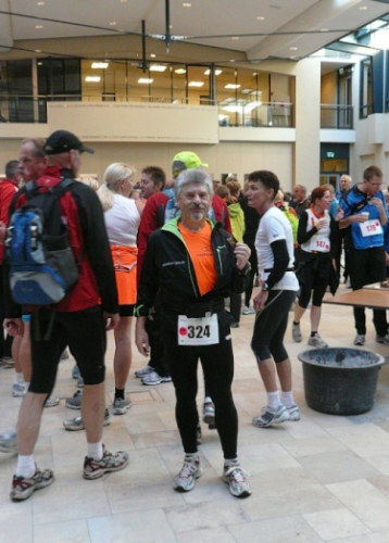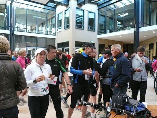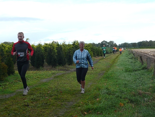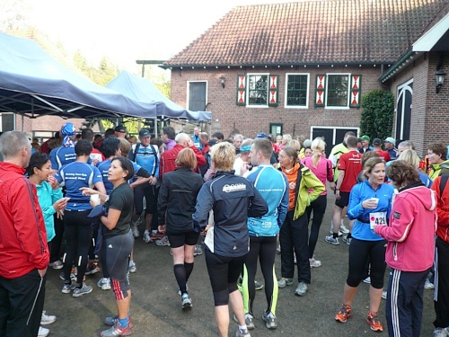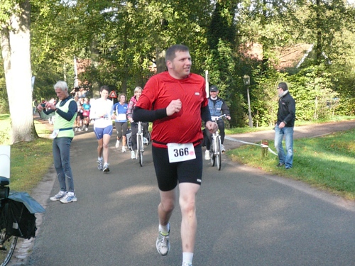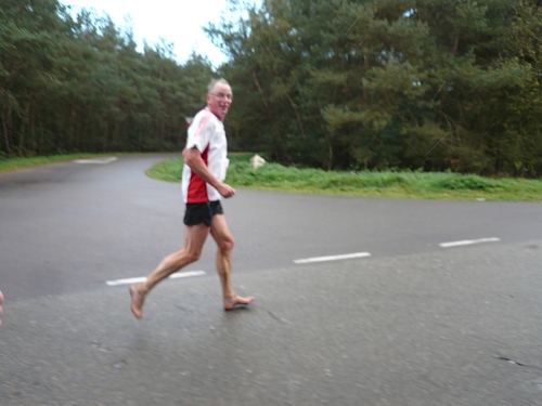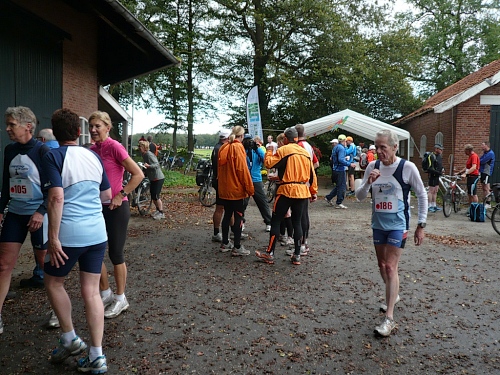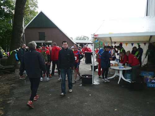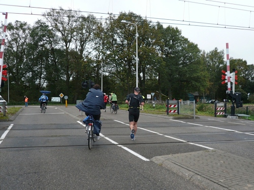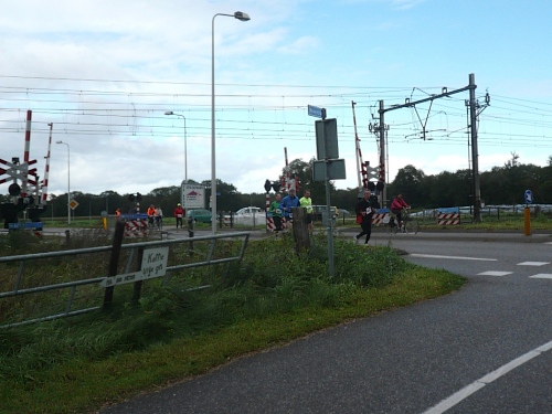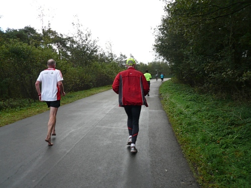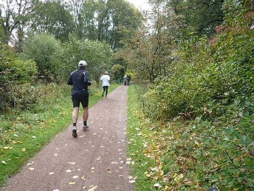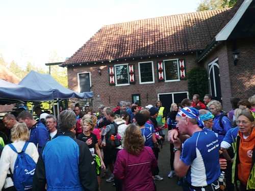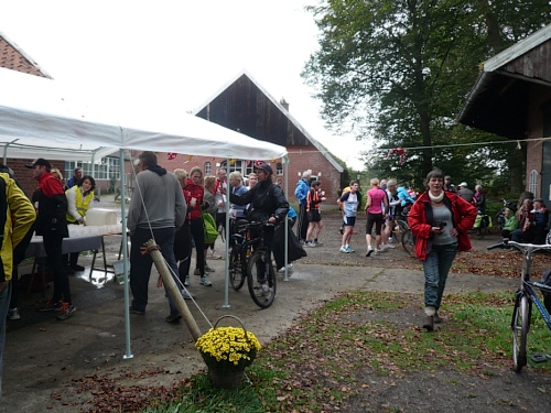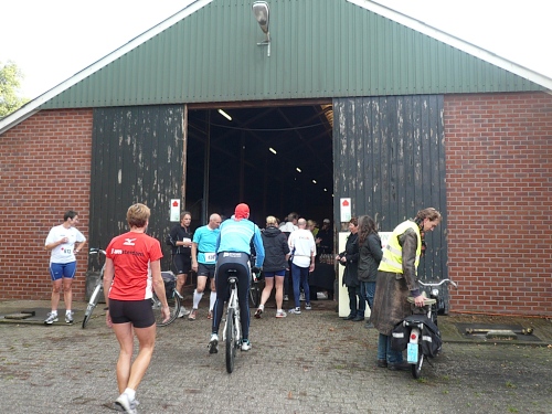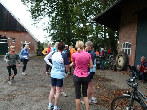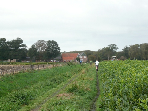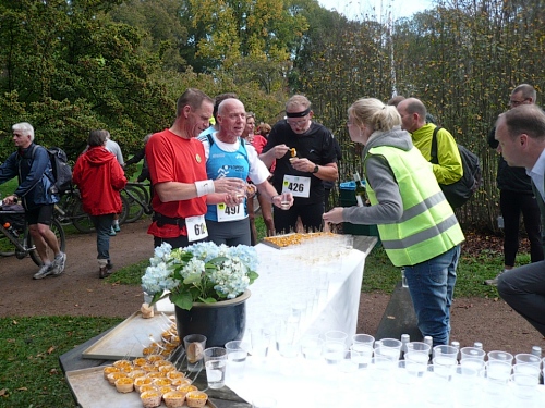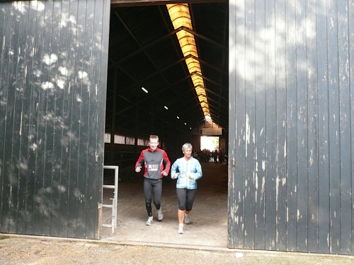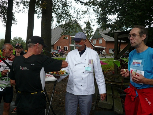 Dann folgen wir einer Bahnlinie und bei km 20,5 gibt es schon wieder was zu Essen. Vor der großen Scheune eines Bauernhofes verteilt ein Mann mit dickem Schnauzbart Obst und Früchte und drinnen stehen die Läufer Schlange für frischen Pfannenkuchen. Sieht lecker aus, aber mir dauert das zu lange. Ich laufe weiter. Gleich ist der Halbmarathon markiert. Über 2 ½ Stunden bin ich unterwegs. Macht nichts, denn auch die anderen Läufer um mich rum haben die Ruhe weg, Essen und Trinken und viel Schwätzen ist heute wichtiger als irgendeine Zeiten. Zielschluss ist ja auch erst nach 6 Stunden.