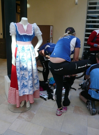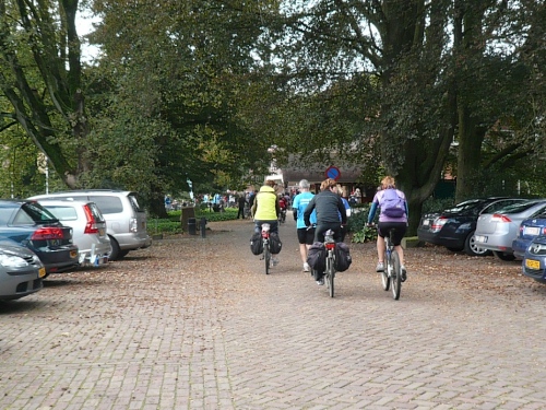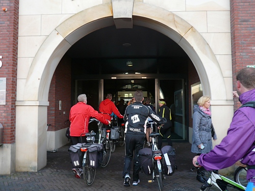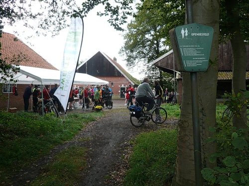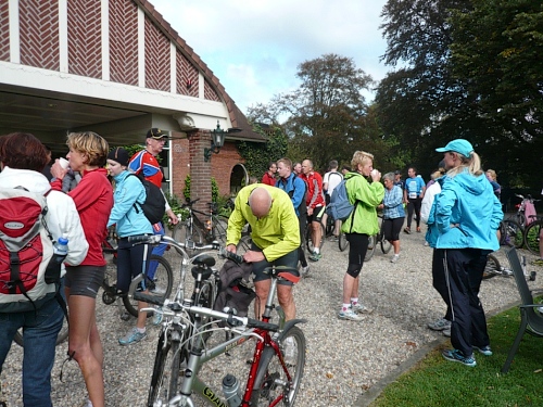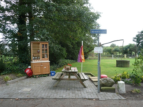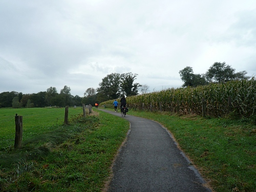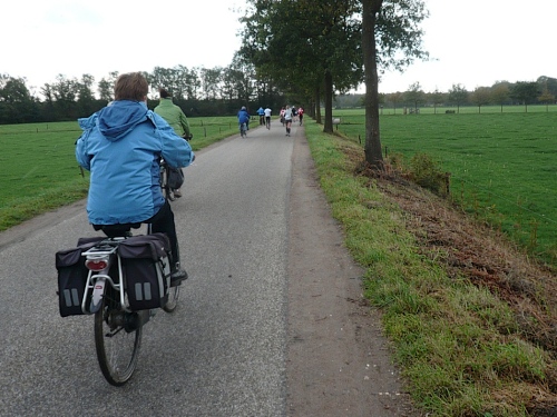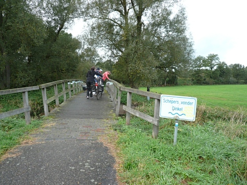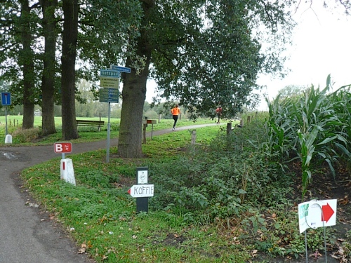 Wir biegen ab auf einen Fietspad (Fahrradweg). Hier hat man einen alten Küchenschrank aufgestellt, an dem man sich selbst mit Koffie bedienen kann. Durch Wiesen und Maisfelder geht es weiter. An einer rutschigen Brücke stürzt eine Radfahrerin, der aber sofort zahlreiche Teilnehmer zu Hilfe eilen. Ein paar Minuten ist die Brücke mit Rädern blockiert. Hektik gibt es keine. Irgendwann geht es in aller Ruhe weiter.