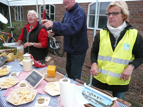 Nach einem Kilometer geht es über einen Wirtschaftsweg wieder auf die Asphaltstraße. Es wird windig und es fängt an zu nieseln. Bei km 14 sind wir am Sägewerk Meuleman mit schon wieder einer Versorgungsstation mit leckerem Käse und handgemachte Musik.