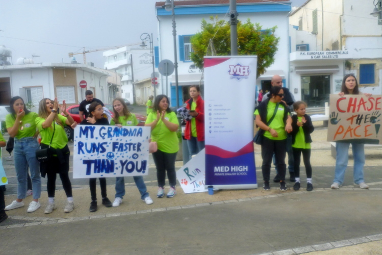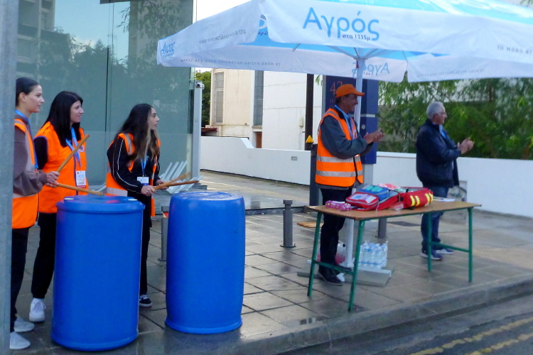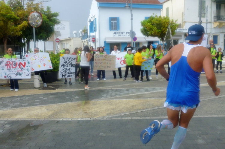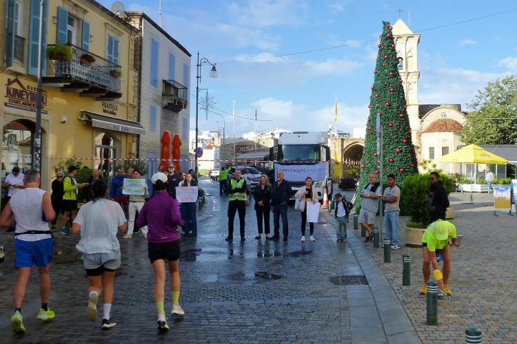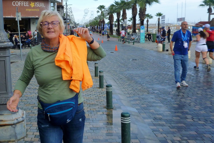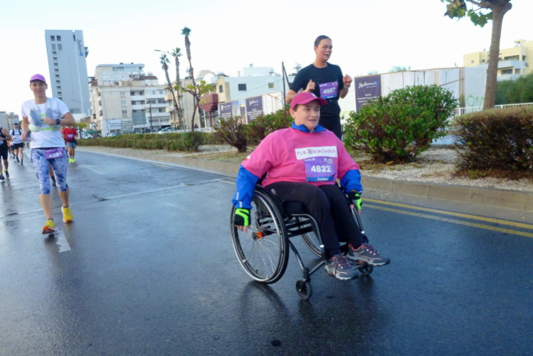 Die Startgerade ist schon weihnachtlich geschmückt, linkerhand passieren wir einen Jahrmarkt mit mehreren Fahrgeschäften inkl. Riesenrad. Riesige Pfützen sind vom morgendlichen Wolkenbruch zurückgeblieben. Wir laufen zunächst nach Osten, biegen am Ende von Finikoudes rechts ab und bleiben auf der rechten Straßenseite, überqueren einen Kreisel. Zwei Rollstuhlfahrerinnen stellen sich dem langen Kanten, gerne lässt sich eine der beiden Ambitionierten von mir ablichten.