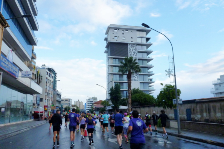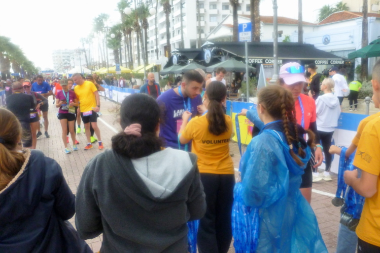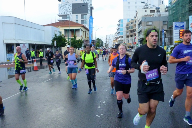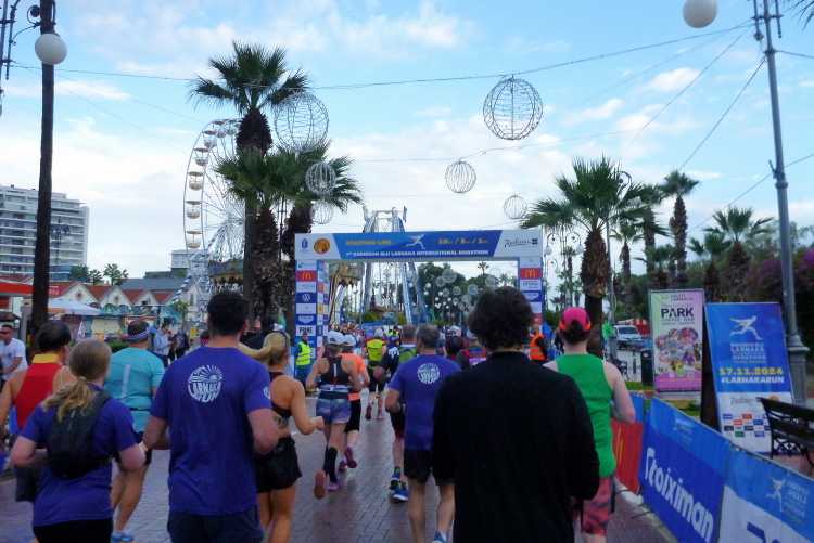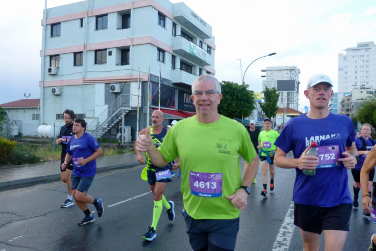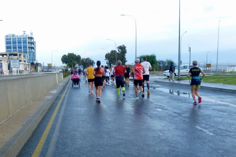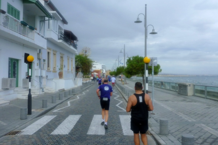 Zwanzig Minuten vor dem Start hört der Regen auf, Schwein gehabt. Schön ist es, selbst hier etliche Bekannte, u.a. von der März-Laufreise nach Malta, zu treffen. Inkognito unterwegs zu sein, das war mal. Eingereiht in ein ordentliches Starterfeld von am Ende 669 Erfolgreichen, fällt an der Strandpromenade Finikoudes, vor dem Rathaus von Larnaka, mit fünf Minuten Verspätung der Startschuss. Das ist doch für mediterrane Verhältnisse sehr ordentlich, oder? Ordentlich ist auch die Temperatur, die schnell auf über zwanzig Grad steigen wird. Hell ist es bereits.