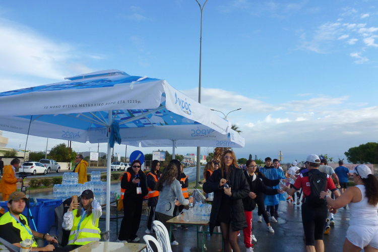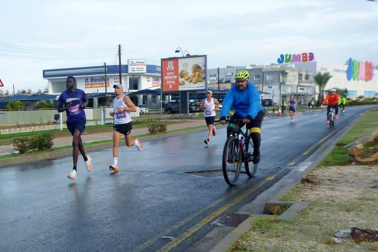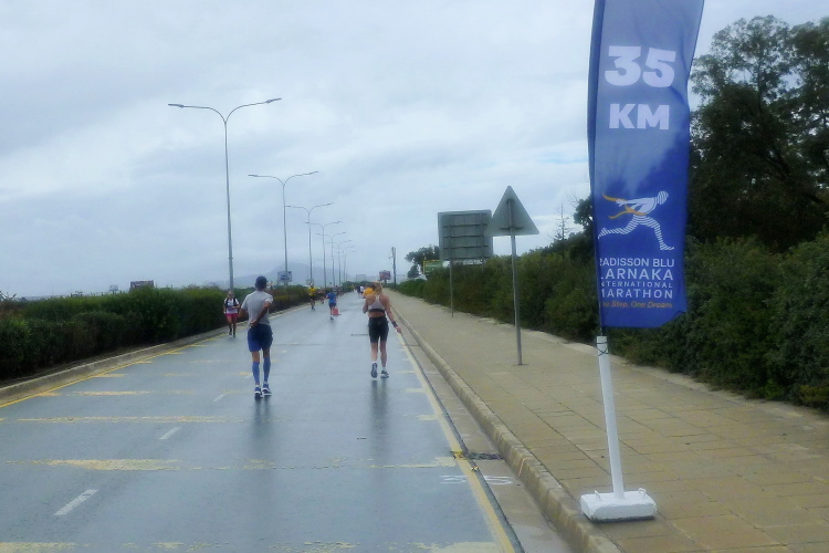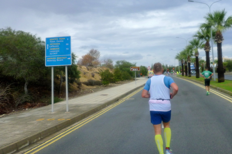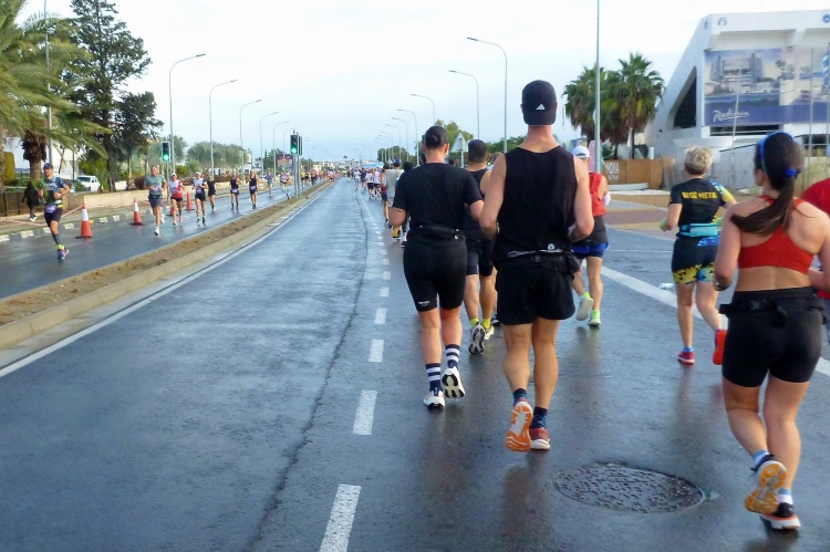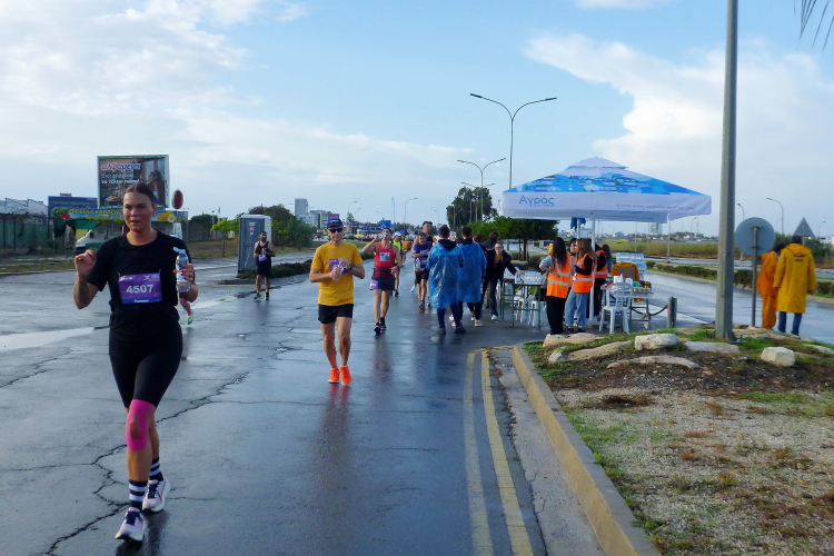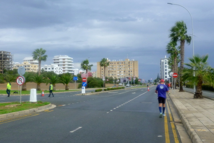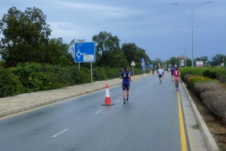 Nacheinander hole ich die Pacer für 5:00 und 4:30 Std. ein, die sich viel zu weit vorne eingereiht hatten. Zweiter Kreisverkehr, die Straße ist breit und verkehrsfrei, der erste VP nach kaum vier km gibt Wasser in Halbliterflaschen aus. Das Für und Wider dieser Darreichungsform hatten wir schon häufiger beleuchtet. Auf der Gegenseite kommt uns bereits die flotte Spitze entgegen, augenscheinlich sind keine bezahlten Gazellen darunter. Vor dem Kreisverkehr beim Larnaca Beach House ist bei der 5-km-Marke der erste von heute vier Wendepunkten erreicht.