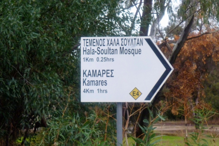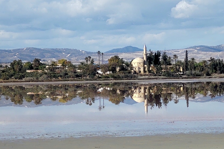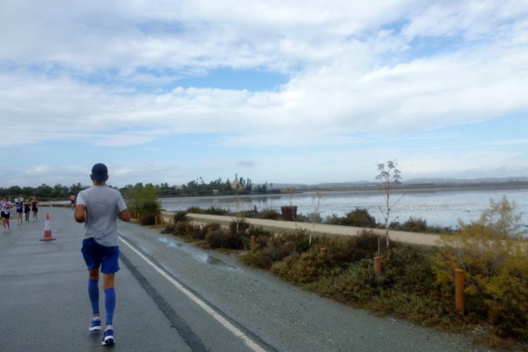 Meine Begierde nach der auch hier ersehnten Medaille treibt mich ab diesem Punkt weiter nach Westen entlang der Artemidos Avenue, vorbei am Flughafen und entlang eines interessanten Salzsees. Er gilt als Wahrzeichen der Region. Nach einem Abbieger nach rechts, weg von der Hauptstraße, erreichen wir die Moschee von Hala Sultan Teke, die den dritten Wendepunkt markiert.