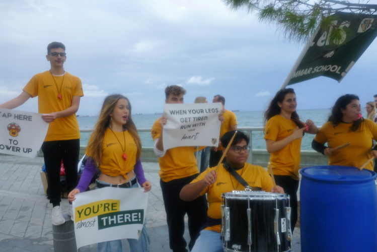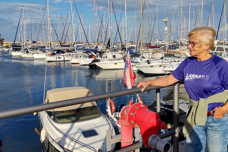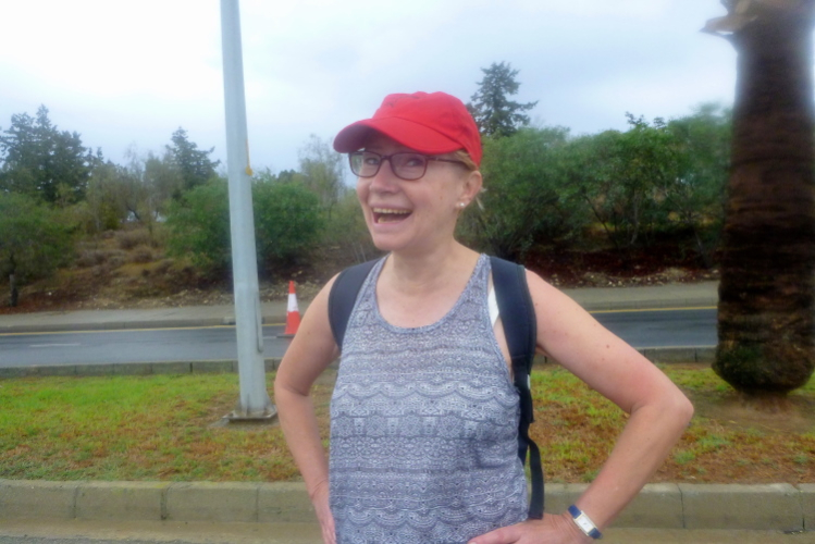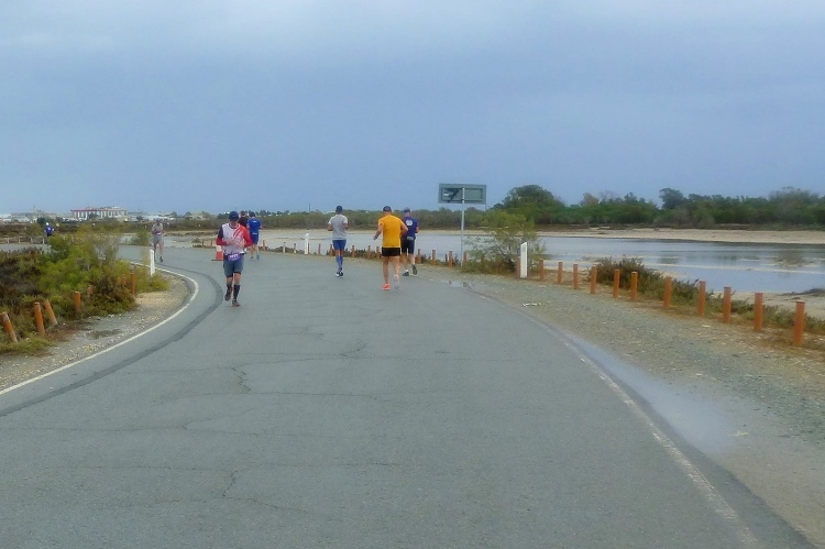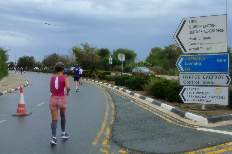 Anschließend laufen wir zum Kreisverkehr des Flughafens Larnaka und weiter, bis wir den letzten Wendepunkt des Rennens erreichen, um zur Küstenstraße Piale Pasa zurückzukehren. Mittlerweile nimmt die Zahl der Wanderer zu, auch die Zug- und Bremsläuferin für 4:15 Std. befindet sich darunter und macht, wenig überraschend, ein bedröppeltes Gesicht.
