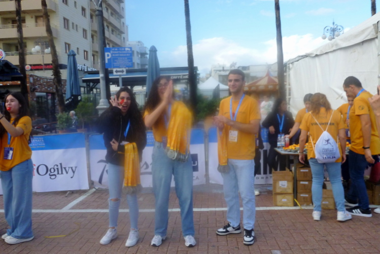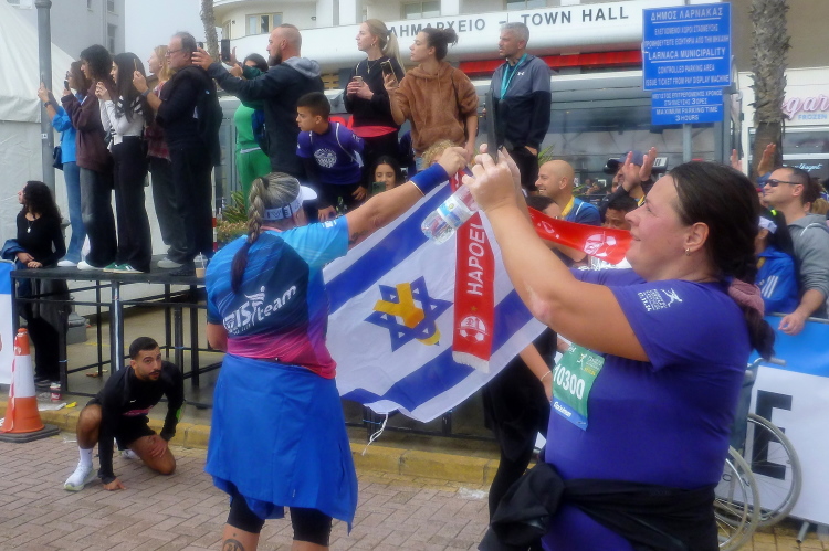 Wir kommen zum dritten und letzten Mal auf die Start-/Zielgerade. Wenige hundert Meter vor dem Torbogen holt wieder mal ein Läufer aus seinem Geheimversteck die Bundesdienstflagge heraus. Unter dem Jubel der versammelten Fangemeinde flattern Mann und Flagge nach 4:28 Std. ins Ziel, wo sie sich mit den Israelis gegenseitig höchsten Respekt zollen und Solidarität versichern. Versehen mit allerlei Ess- und Trinkbarem ziehen Aphrodite und ich zufrieden von dannen.