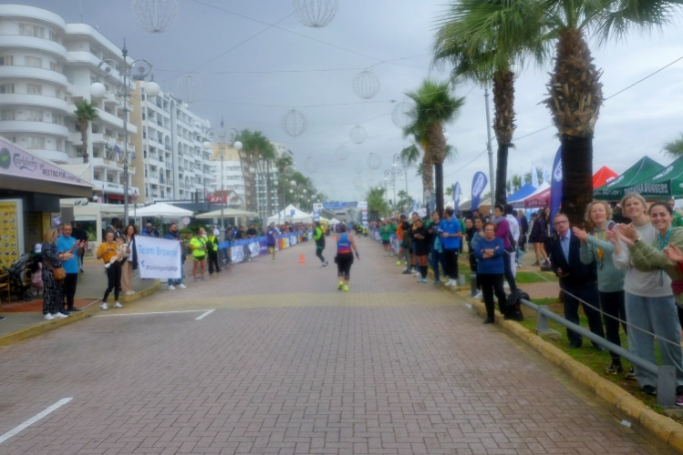 Erneut an der Streckenteilung angekommen, dürfen wir jetzt rechts abbiegen, nach links ist für die um zehn Uhr gestarteten Fünfer und Zehner ausgeschildert. Letzterem wird sich meine Aphrodite erfolgreich widmen und zu ihrer großen Freude jede Menge Konkurrenz hinter sich lassen. Die echte der griechischen Mythologie, Göttin der Schönheit und Begierde, soll auf Zypern zwischen Páfos und Limassol dem Meer entstiegen sein.