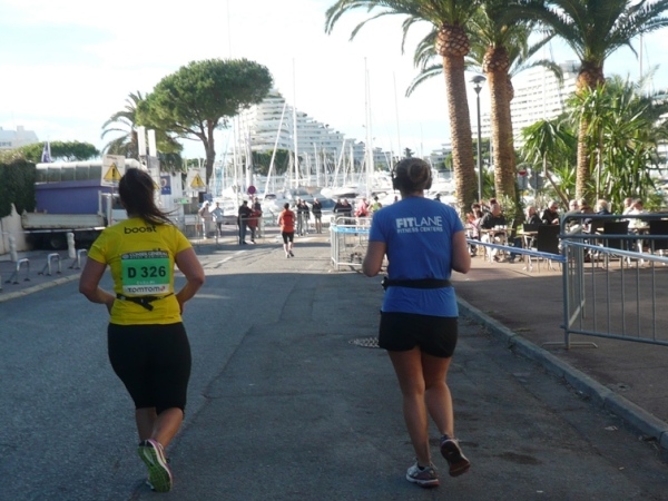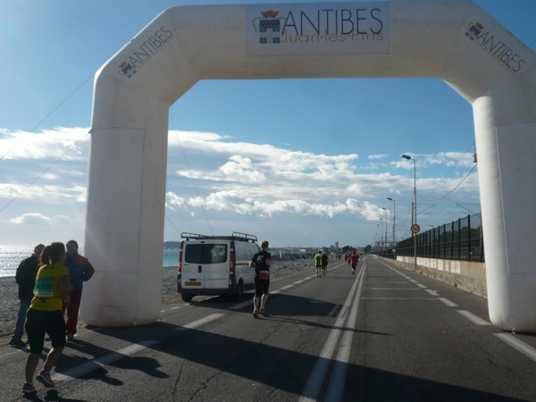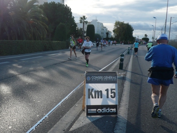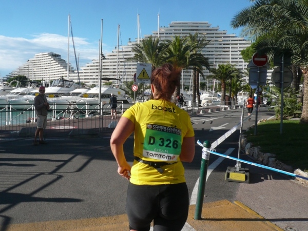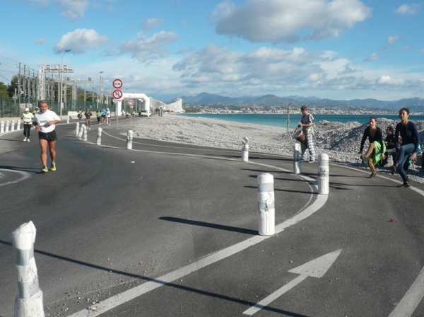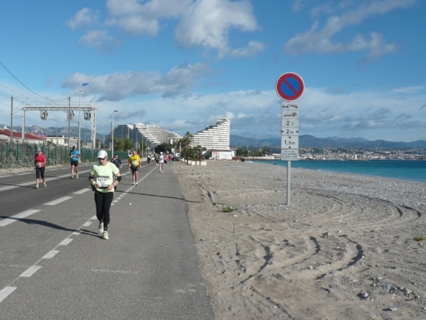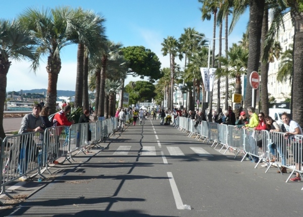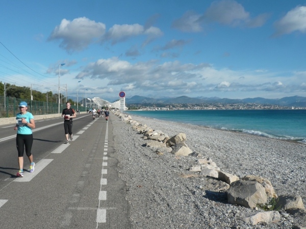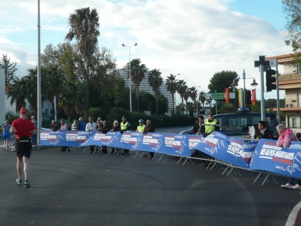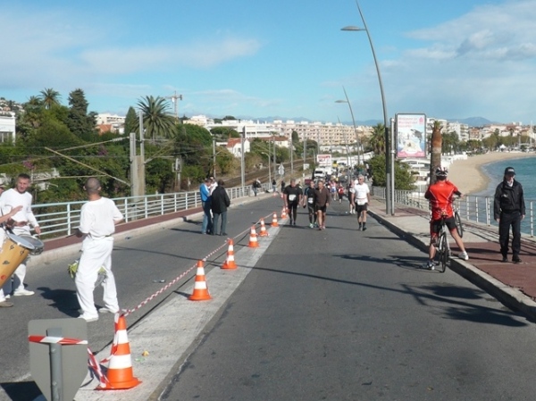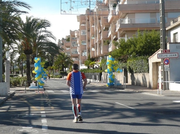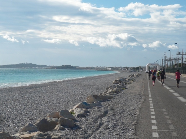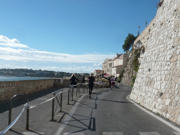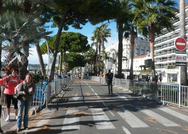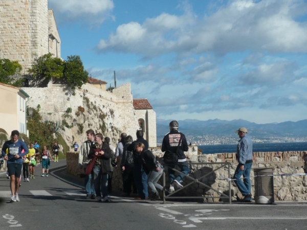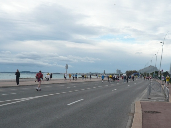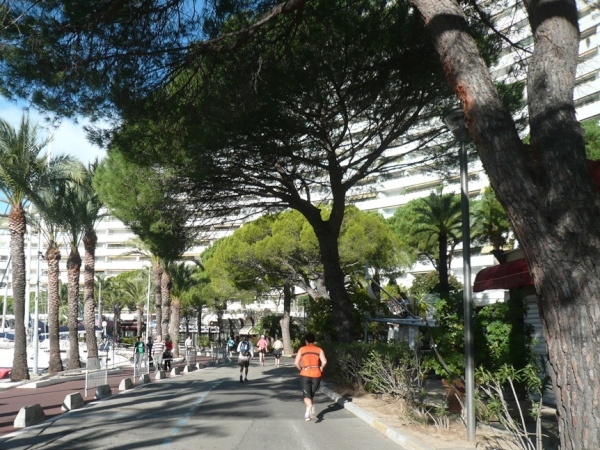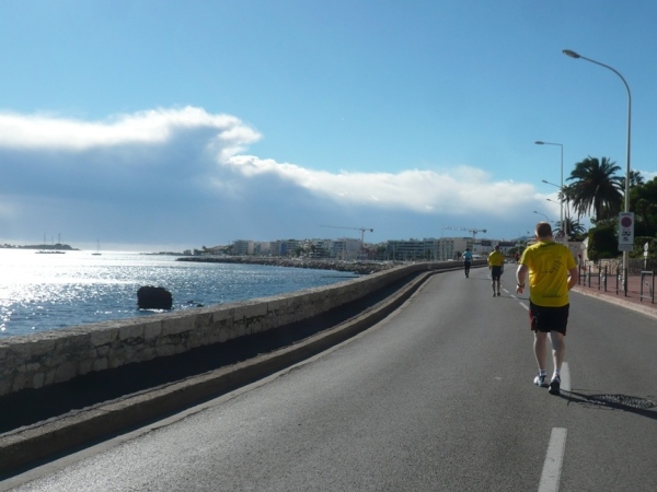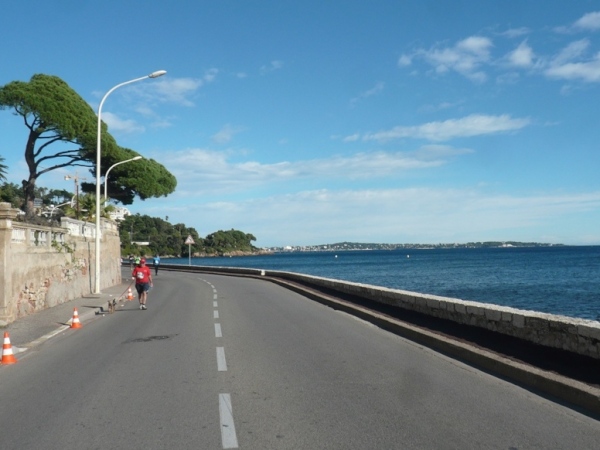 Am Kiefernwald Juan-les-Pins, an dem wir gerade vorbei laufen, findet jedes Jahr das berühmte Festival de Jazz d'Antibes Juan-les-Pins statt. Wir sind in der romantischen Bucht von Golfe-Juan. Man sagt, sie wäre das nahezu perfekte Abbild der Schönheit der Riviera. Am Casino vorbei kommen wir auf die sonnige Uferstraße. Es sind noch 10km bis zum Ziel und die werden nicht leicht. Der Wind bläst kräftig von vorn und vom Strand wird uns feiner Sand ins Gesicht geblasen. Um mich rum wird in allen möglichen Sprachen geflucht. Vom Wind wurden auch die geplanten Streckenrekorde verweht. Die Sieger blieben 5 Minuten darüber. Mich kostet der Wind nur 2 – 3 Minuten. Das aber auf jedem Kilometer auf diesem Abschnitt.