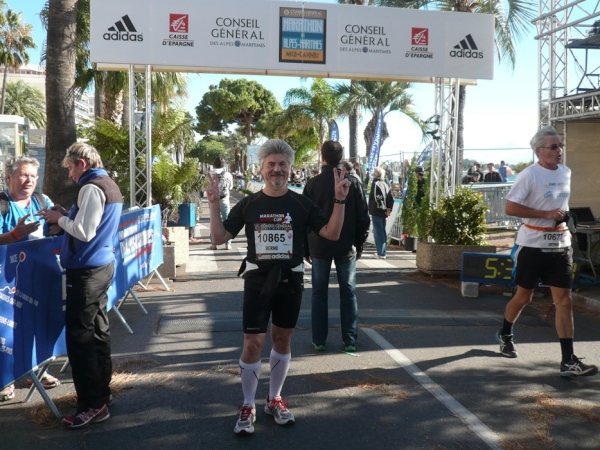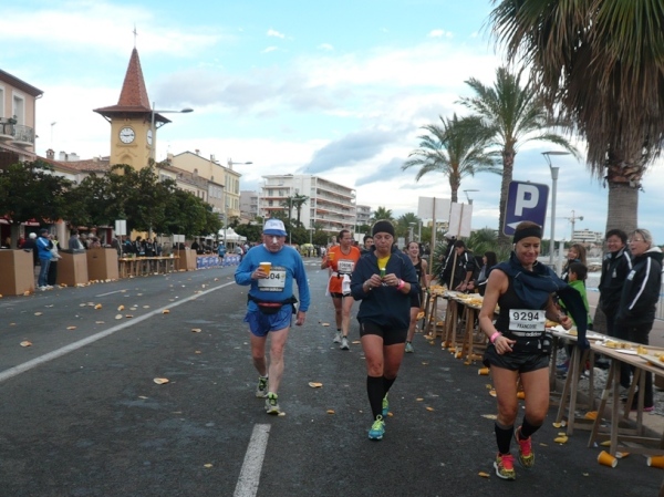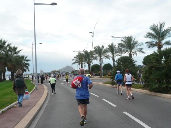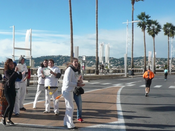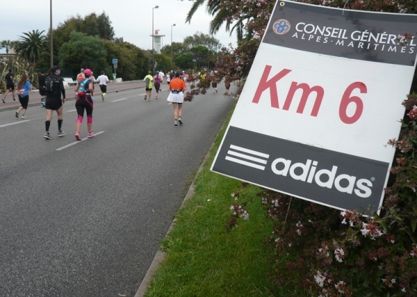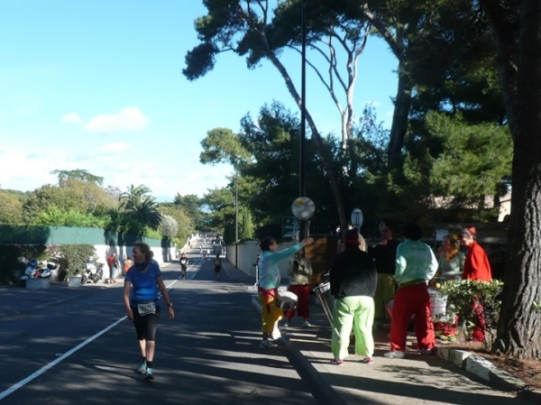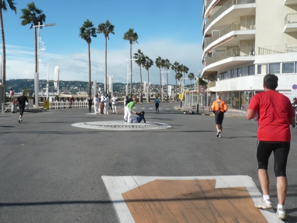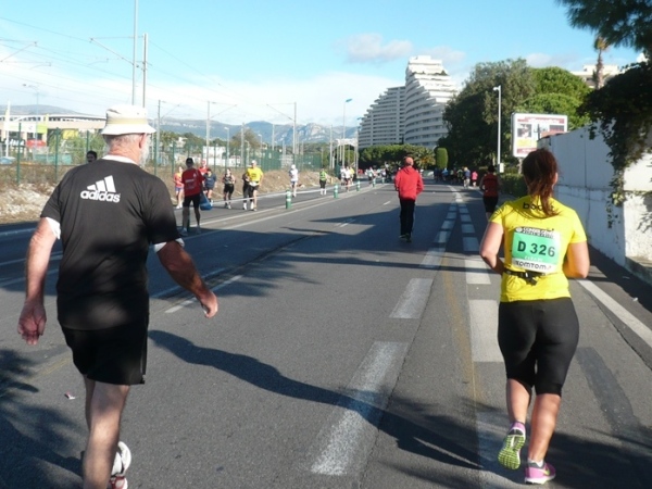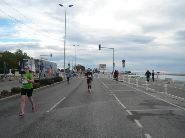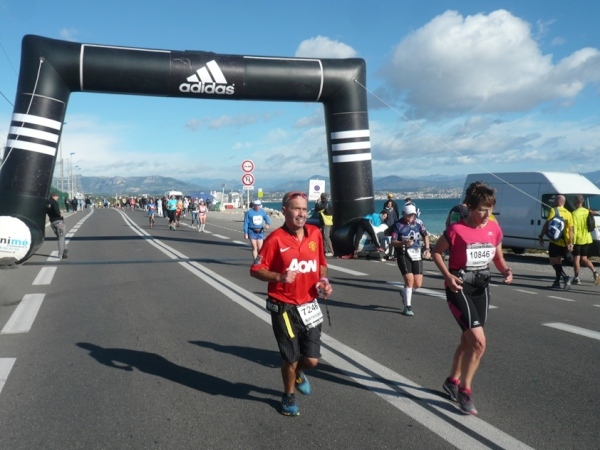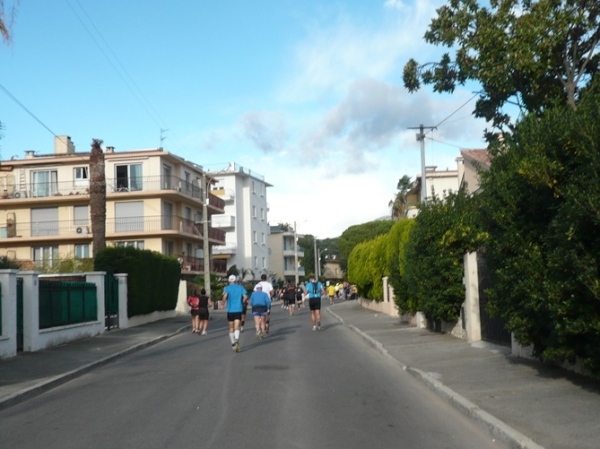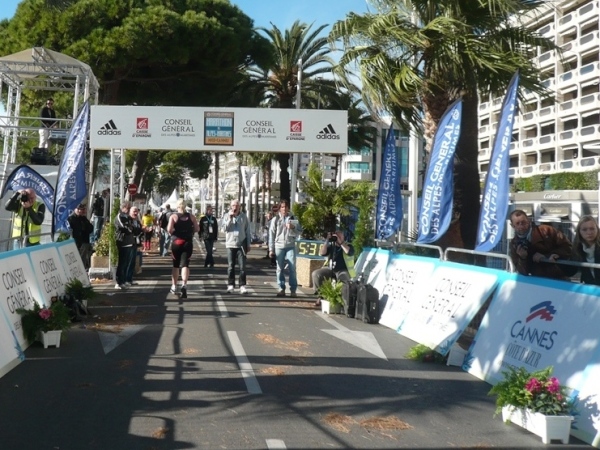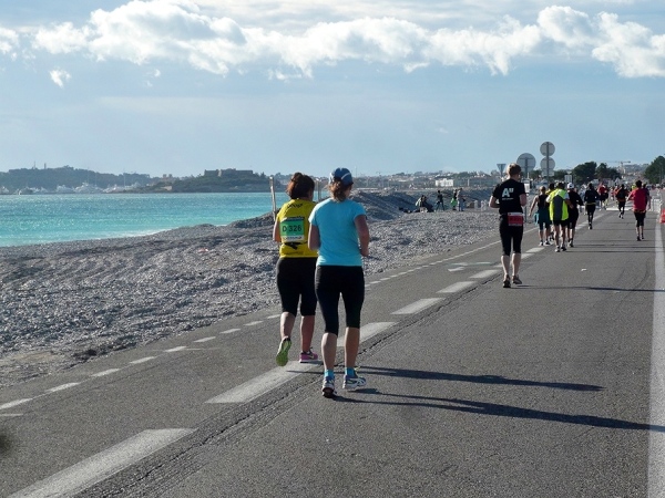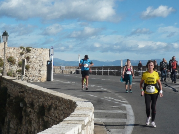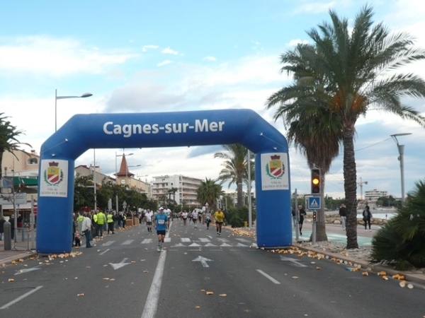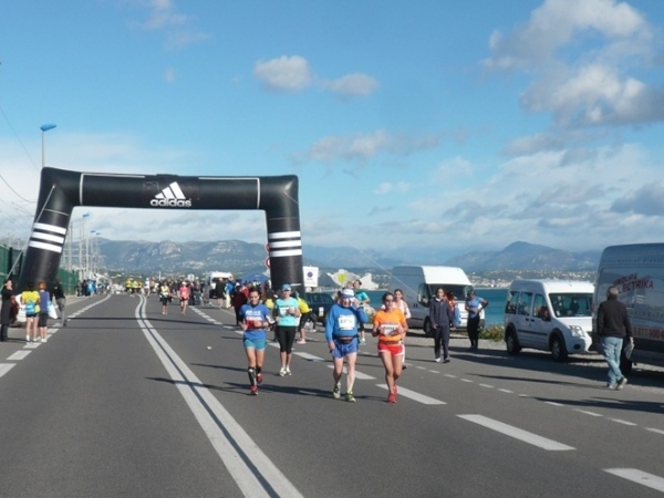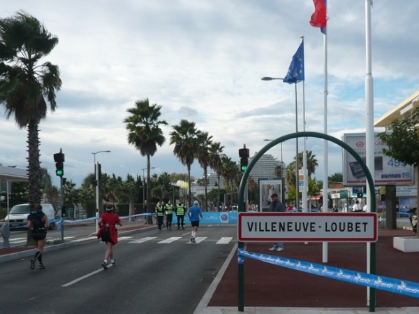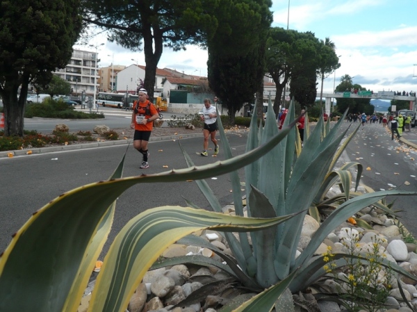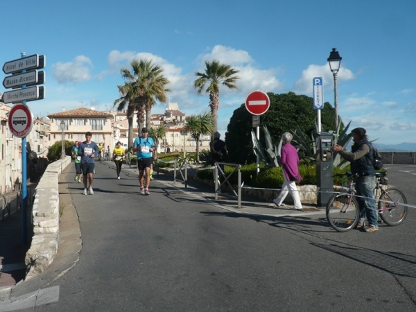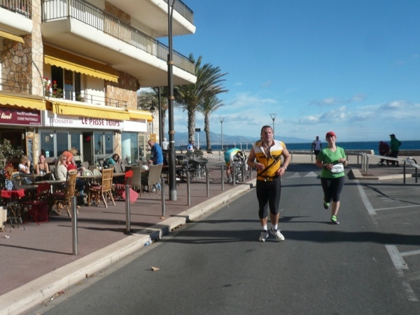 Am Kiefernwald Juan-les-Pins, an dem wir gerade vorbei laufen, findet jedes Jahr das berühmte Festival de Jazz d'Antibes Juan-les-Pins statt. Wir sind in der romantischen Bucht von Golfe-Juan. Man sagt, sie wäre das nahezu perfekte Abbild der Schönheit der Riviera. Am Casino vorbei kommen wir auf die sonnige Uferstraße. Es sind noch 10km bis zum Ziel und die werden nicht leicht. Der Wind bläst kräftig von vorn und vom Strand wird uns feiner Sand ins Gesicht geblasen. Um mich rum wird in allen möglichen Sprachen geflucht. Vom Wind wurden auch die geplanten Streckenrekorde verweht. Die Sieger blieben 5 Minuten darüber. Mich kostet der Wind nur 2 – 3 Minuten. Das aber auf jedem Kilometer auf diesem Abschnitt.