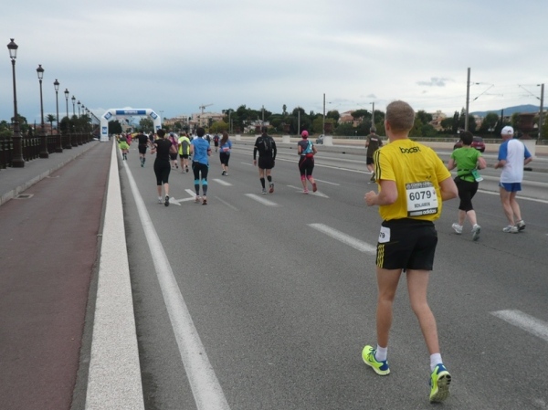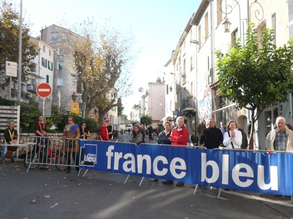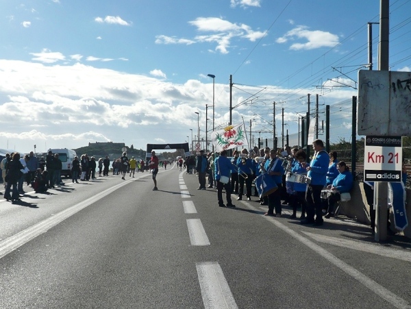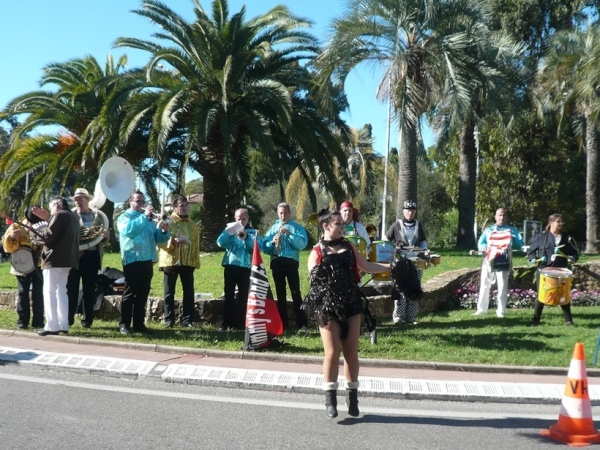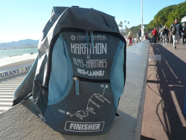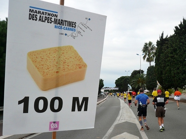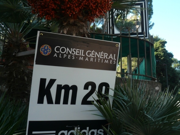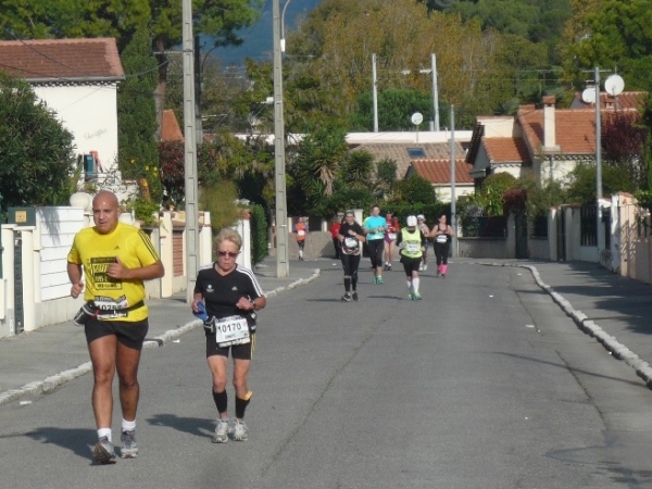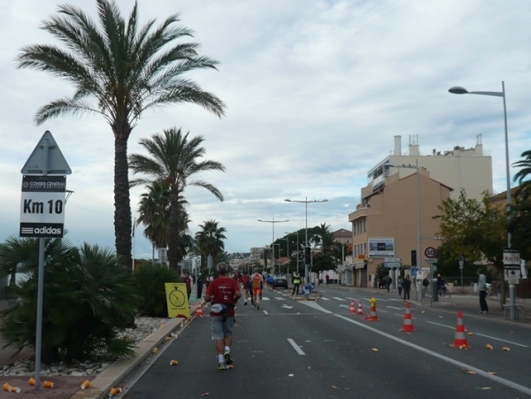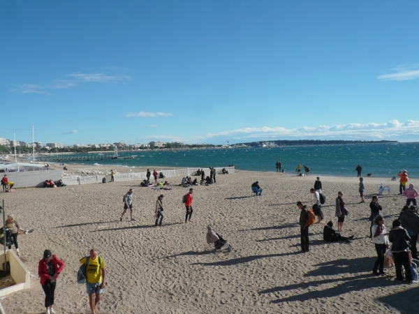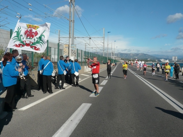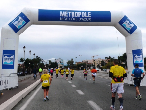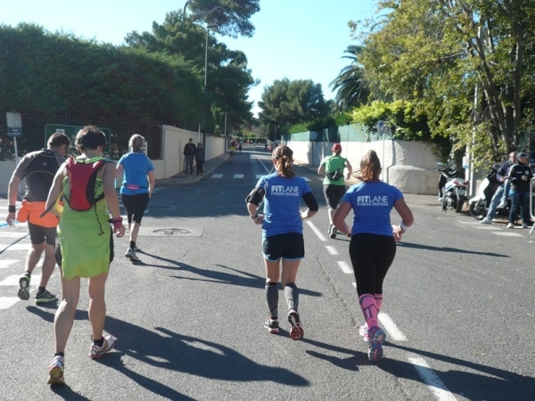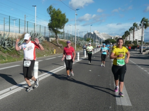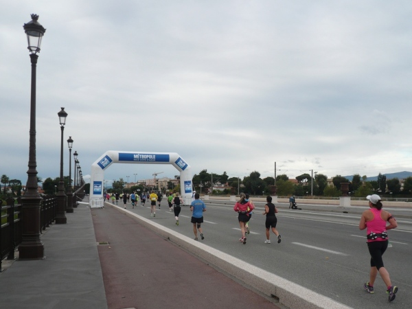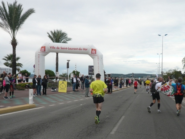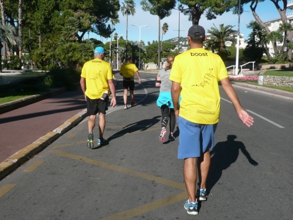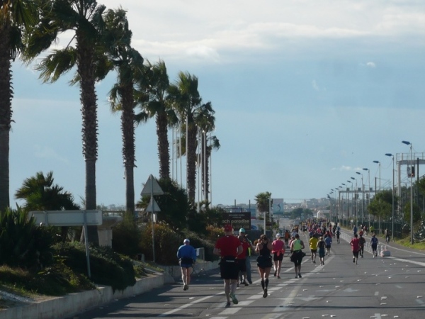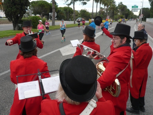 Am Kiefernwald Juan-les-Pins, an dem wir gerade vorbei laufen, findet jedes Jahr das berühmte Festival de Jazz d'Antibes Juan-les-Pins statt. Wir sind in der romantischen Bucht von Golfe-Juan. Man sagt, sie wäre das nahezu perfekte Abbild der Schönheit der Riviera. Am Casino vorbei kommen wir auf die sonnige Uferstraße. Es sind noch 10km bis zum Ziel und die werden nicht leicht. Der Wind bläst kräftig von vorn und vom Strand wird uns feiner Sand ins Gesicht geblasen. Um mich rum wird in allen möglichen Sprachen geflucht. Vom Wind wurden auch die geplanten Streckenrekorde verweht. Die Sieger blieben 5 Minuten darüber. Mich kostet der Wind nur 2 – 3 Minuten. Das aber auf jedem Kilometer auf diesem Abschnitt.