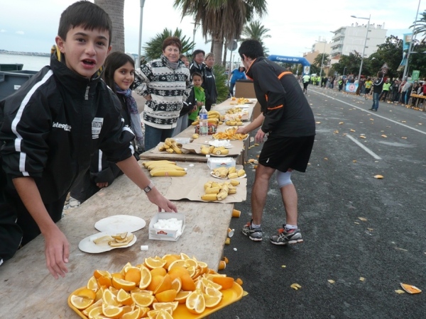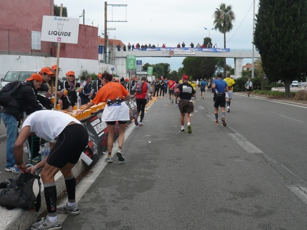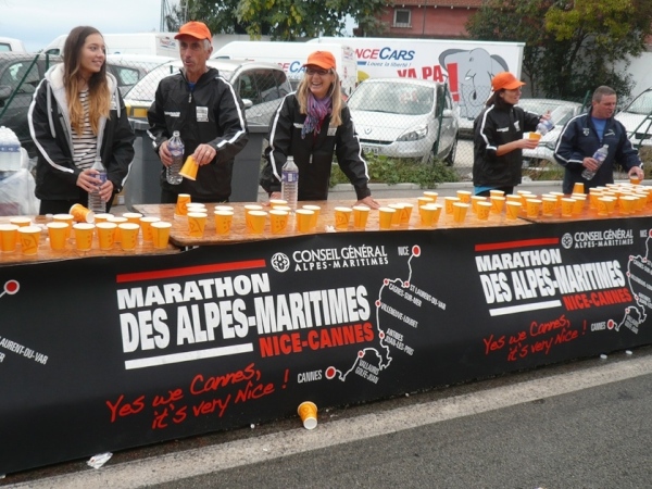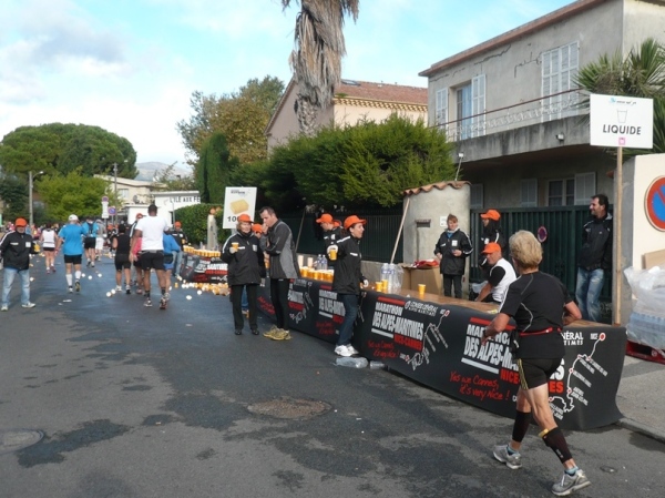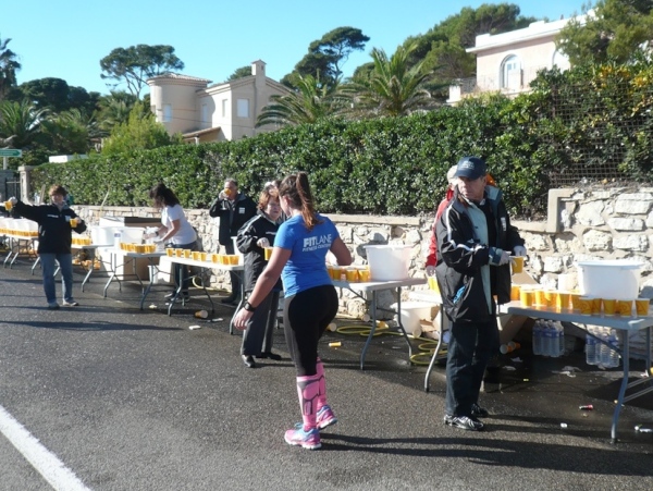 Wir folgen jetzt der Route du Bord de Mer. Bei km 8 gibt es die nächste Wasserstation, die auch Schwämme für uns bereithält. Obwohl es jetzt noch nicht sehr warm ist, greifen viele danach. Wir kommen wieder ans Meer. Hier ist für die Staffeln der erste Wechsel. Durch eine extra abgesperrten Zone gibt es dadurch keinerlei Behinderungen. Gute Lösung.
