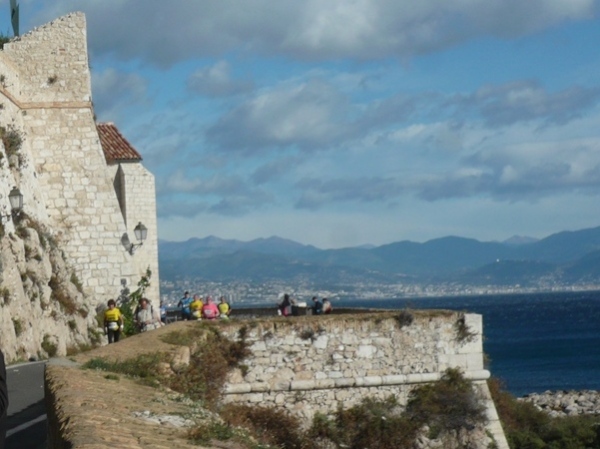 Der Straße zwischen Meer und Bahnlinie folgen wir rund 4 km. Zurück hat man einen herrlichen Blick bis in die Bucht von Nizza. Die großen Appartementhäuser hinter uns am Horizont werden immer kleiner und das Fort Carre von Antibes vor uns wird langsam größer. Links der Kiesstrand, rechts die Mauer und dann kurz vor Antibes kommt das große schwarze Tor. Hier liegt eine Zeitmatte, die 1. Hälfte ist geschafft.