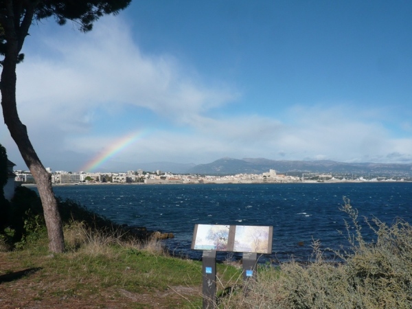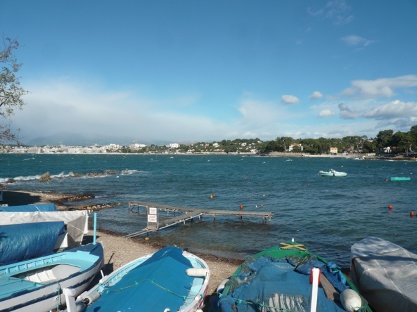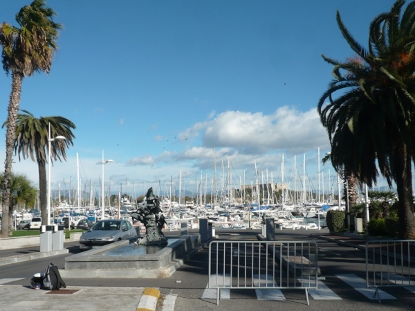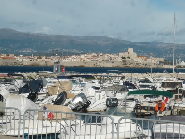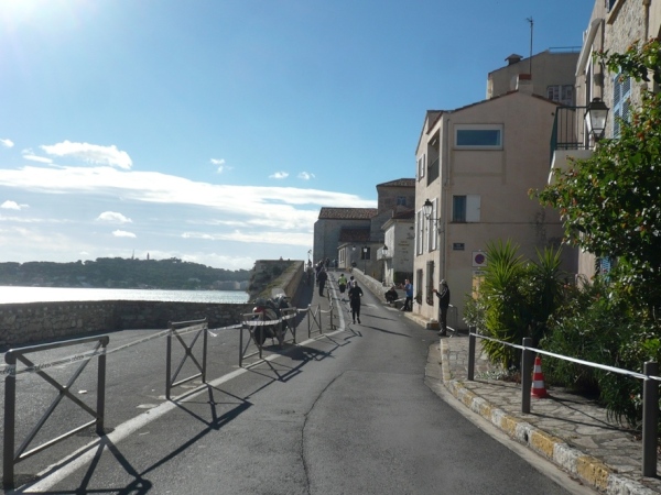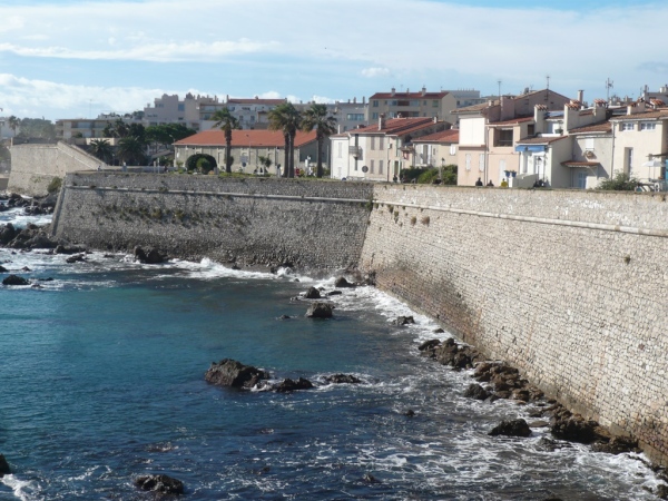 Dann kommt der Stadtrand von Antibes. Wir laufen am Hafen entlang Richtung Stadtmauer. Durch das alte Stadttor gelangen wir an den Rand der Altstadt. Geradeaus ginge es direkt in die Altstadt. Dort steht am Marktplatz, dem Cours Masséna, eine große, gusseiserne Halle, die 1900 erbaut wurde. Das Hallendach reicht von einer Straßenseite zur anderen. In der Halle türmen sich Berge von Aubergines, Melonen, Cabécou-Ziegenkäse, sowie ein reichhaltiges Fischangebot (frisch aus dem Meer) und würzig duftenden Würsten. Um die Halle gibt es viele kleine Cafes, in den engen Gassen nette Geschäfte und Restaurants.