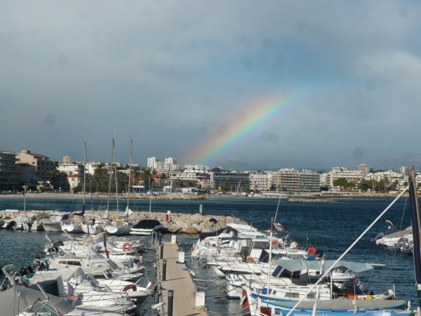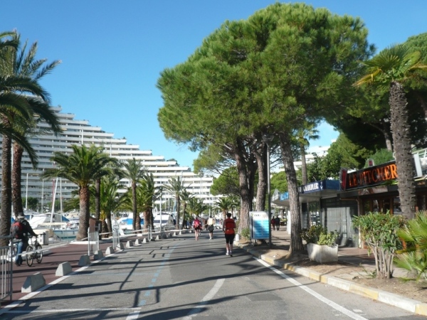 Ein Stück weiter sehen wir an der Südspitze von Cannes die Lerins Inseln. Der Blick fällt auf die 210ha große Ile Ste-Margueritè die mit Eukalyptusbäumen und Pinien begrünt ist. Dahinter liegt die viel kleinere Ile St-Honorat, auf der es sogar Weinberge gibt. Auch ein Kloster aus dem 11. Jahrhundert kann hier besichtigt werden. Wir laufen immer am Meer entlang auf die Inseln zu und sind bald am Stadtrand von Cannes. Bei km 40 direkt an der Südspitze steht das Palm Beach Casino. Dann beginnt die weltberühmte Flaniermeile von Cannes, der Boulevard de la Croisette. Es ist nicht mehr weit zum Ziel. Die Palmenallee führt uns direkt dorthin.