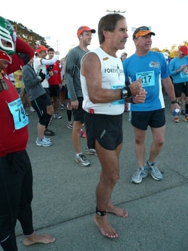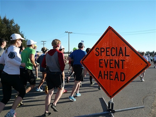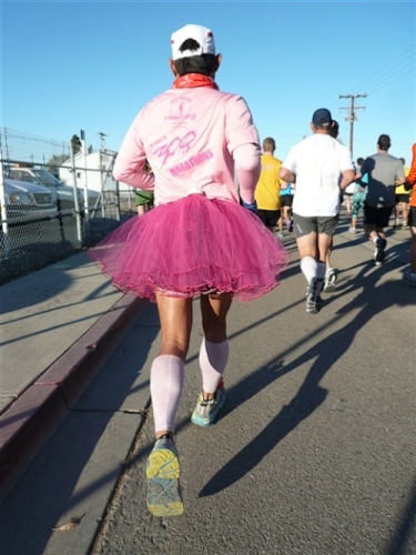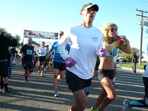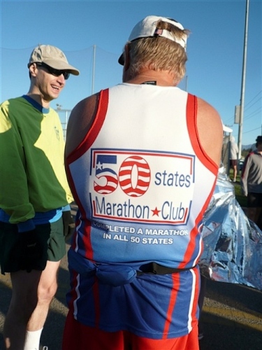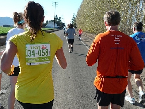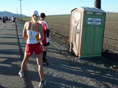 Auffällig sind die zahlreichen japanischen Teilnehmer, die über den Pazifik mal gerade eben auf die andere Seite gewechselt sind. Ich überhole den heutigen Marathon-Rekordhalter, den der Starter in der Wartezeit ermittelt hatte: Auf 426 Zähler schraubt er heute sein Konto. Unterwegs müsste ich mich mal in die Büsche schlagen, aber das geht bei den Amis gar nicht. Vereinzelt stehen Dixi-Klos am Rand, aber ich habe keinen Bock auf Anstehen, denn natürlich warten da schon die ersten Mädels. Irgendwann finde ich dann eine Baumreihe, hinter der man sich doch gut verstecken kann, und traue mich, allerdings nicht als erster. Keiner verhaftet mich, Glück gehabt.