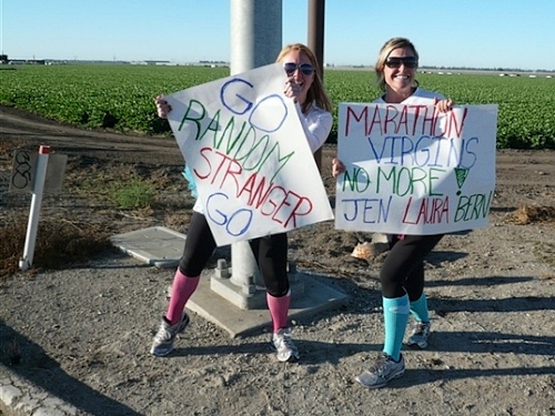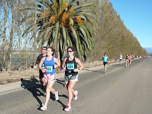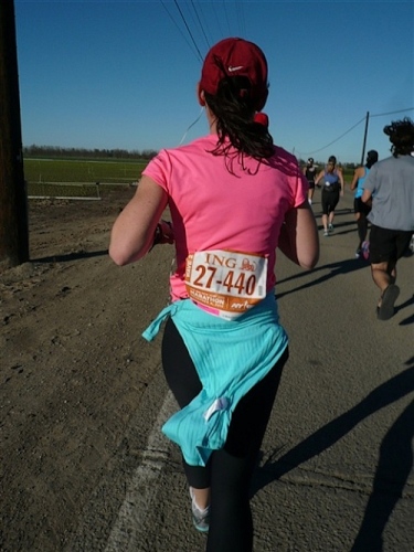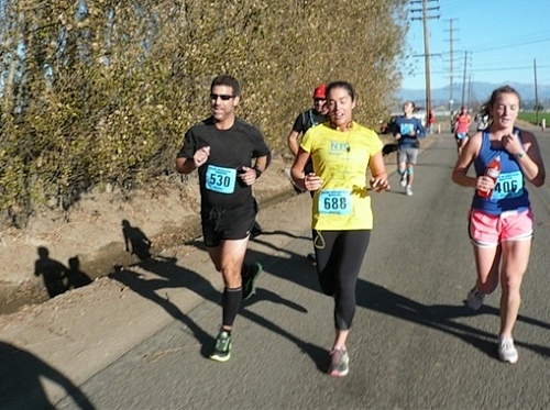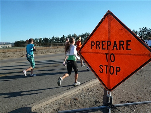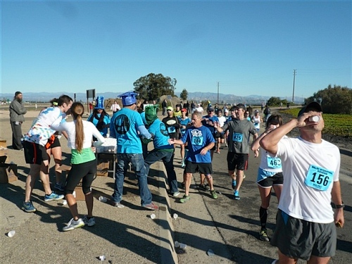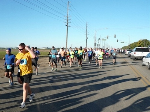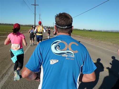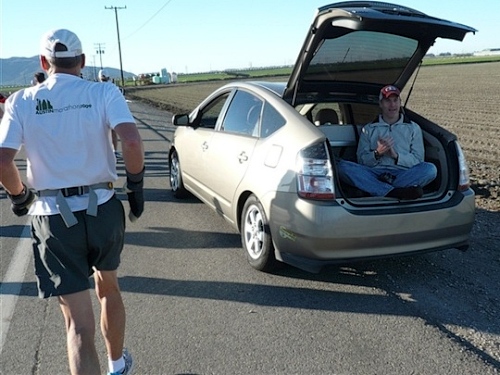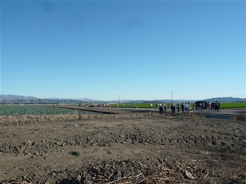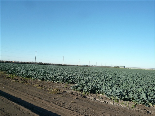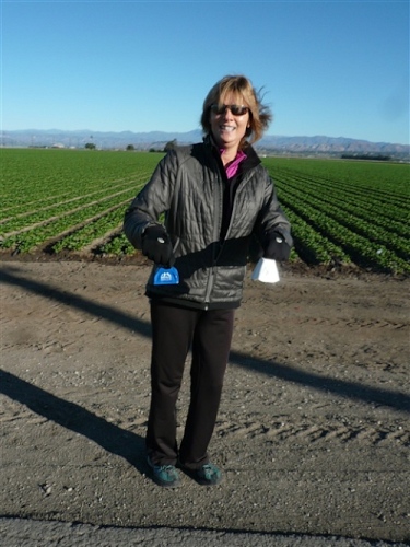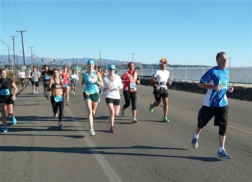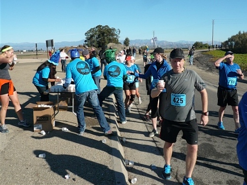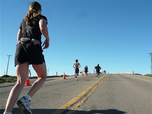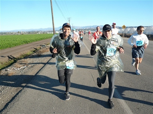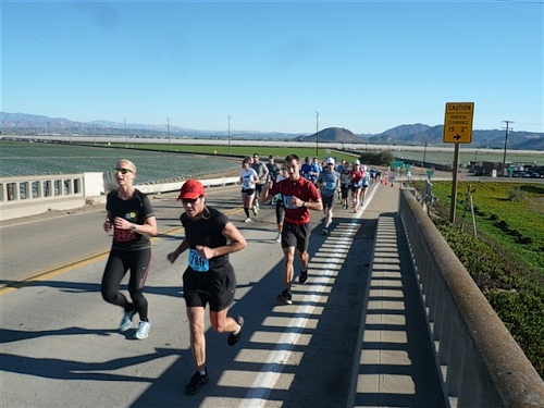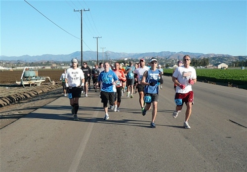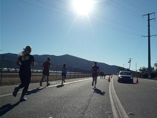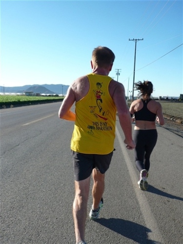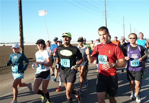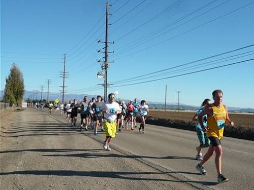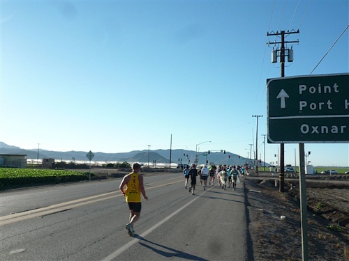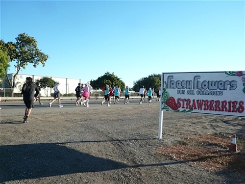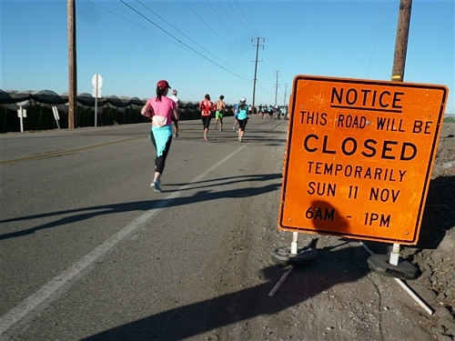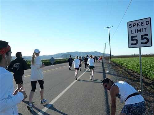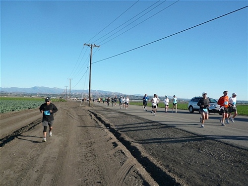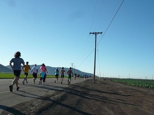 Wir laufen einmal ums Karree, dann führen die ersten Kilometer vorbei an riesigen Gemüsefeldern. Wenn man das sieht, glaubt man gerne, daß von hier aus die halbe Nation mit Gemüse und Obst beliefert wird. Man sieht viele mexikanische Landarbeiter, die unter harten Bedingungen ihr karges Brot verdienen. Völlig flach ist der Kurs bisher, der Blick geht weit voraus und kündigt bereits hier eine harte mentale Prüfung an, denn Zuschauer hat’s nur ganz vereinzelt. Wenigstens ist der Himmel wolkenlos, aber das haben wir Älteren ja schon bei Ilja Richters „Disco“ von Albert Hammond gelernt: „It ne-he-ver rains in Californa…“