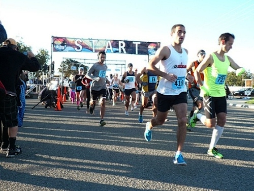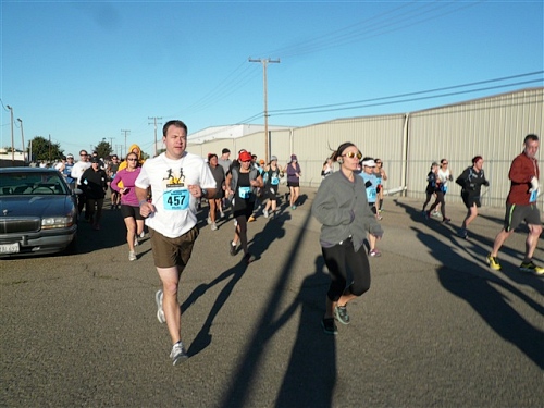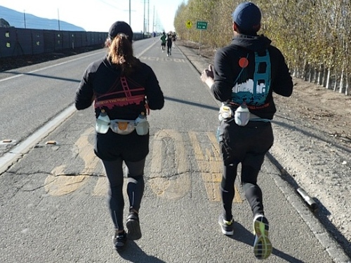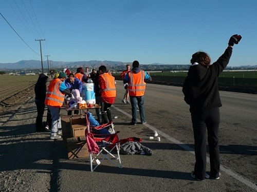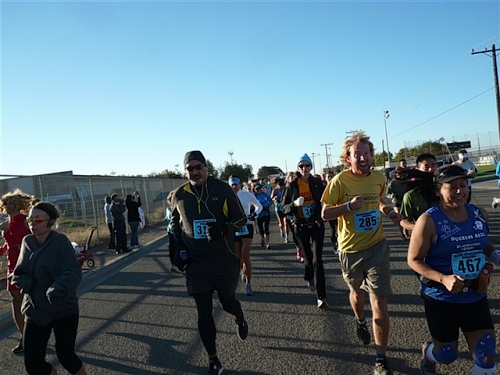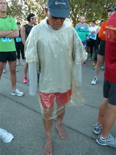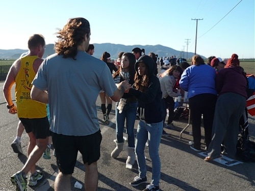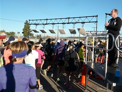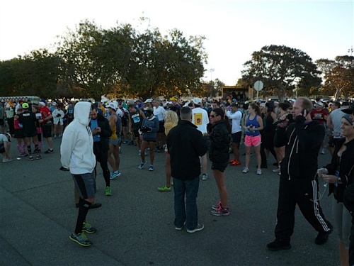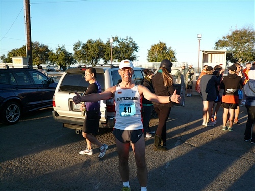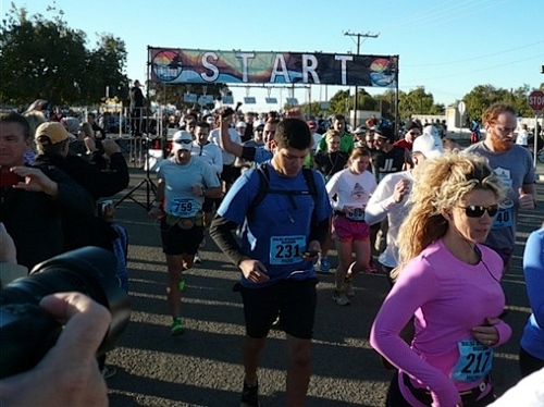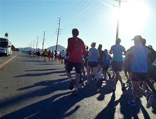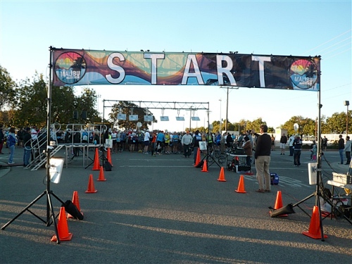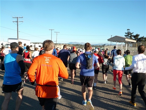 Nach rund 30 min. Fahrzeit kommen wir in Camarillo an, mit etwa 5° ist es knackig kalt. Zehn Minuten vor dem Start, die ersten Sonnenstrahlen, spenden wenigstens etwas Wärme, entscheide ich mich für „Kurz“ und entledige mich meines Langarmshirts. Weitere fünf Minuten später gebe ich meinen Rucksack auf den letzten Drücker ab und beginne zu frieren. Macht ja nichts, der Start ist ja gleich. Um 7:10 Uhr ist allerdings immer noch nichts passiert und ich friere wie ein Schneider. „That’s Malibu“, meint mein Nachbar angesichts meiner Ungeduld. Erst um 7:30 Uhr dürfen wir dann los, woran es gelegen hat, wird wohl immer deren Geheimnis bleiben.