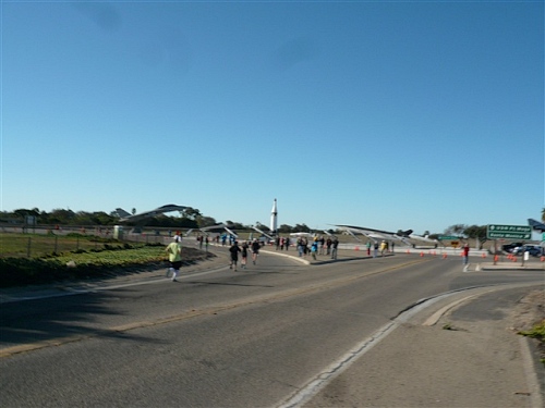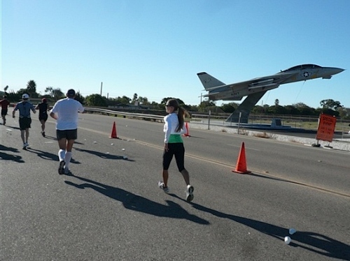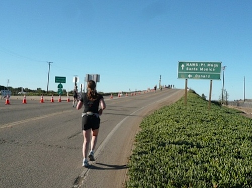An der ersten von 18 Verpflegungsstellen gibt es nur Wasser, bald aber kommt Iso dazu, dreimal geben sie sogar Gels aus, was in den USA durchaus nicht üblich ist. Zäh ziehen sich die km über plattestes Land, Gemüse links, Gemüse rechts, und Läufer in der Mitte. Und dann sehe ich sie tatsächlich, und das mehrfach: Startnummern von New York, die etliche Läufer hinten ans Trikot geheftet haben, der Aufruf scheint also doch auf Gehör gestoßen zu sein. Ob das in Santa Barbara, wo der Marathon gestern stattfand, ebenso war? Ein erster, aber vorerst einziger Aufstieg führt uns über eine Brücke, die zu einer Navy-Liegenschaft („Point Mugu“) führt, vor der wir links abbiegen. Vorher dürfen wir aber die ausgemusterten Kampfjets bewundern, die sie an der Straße ausgestellt haben.