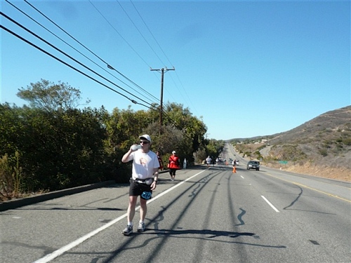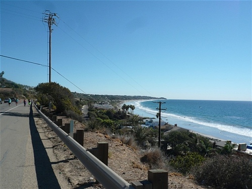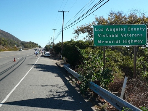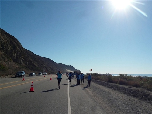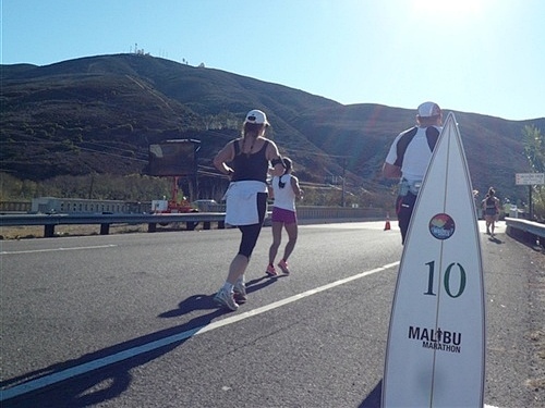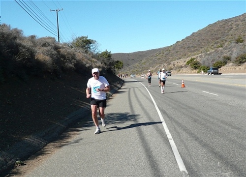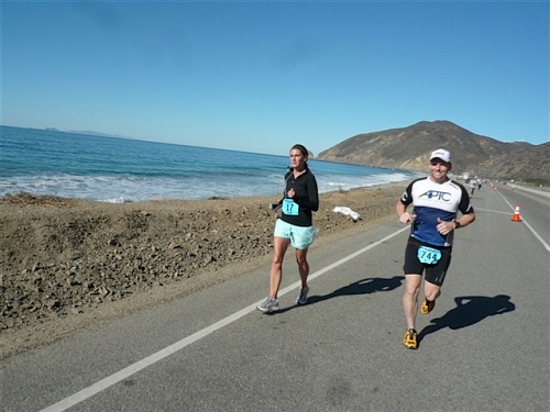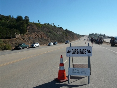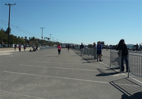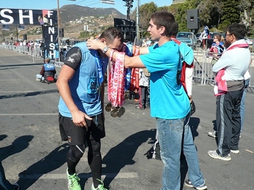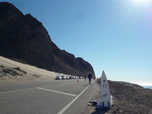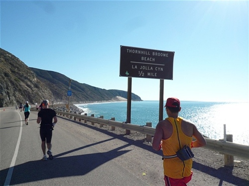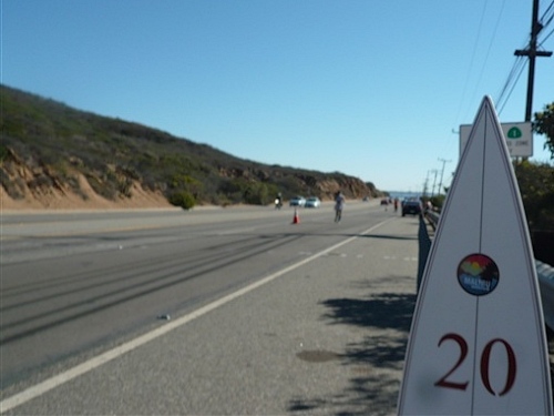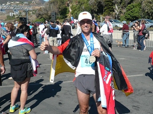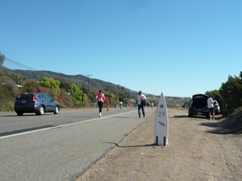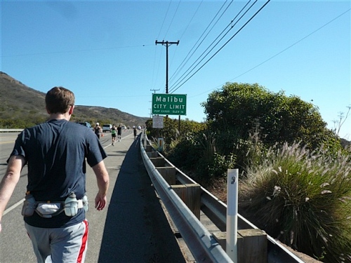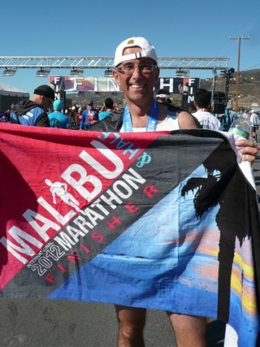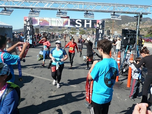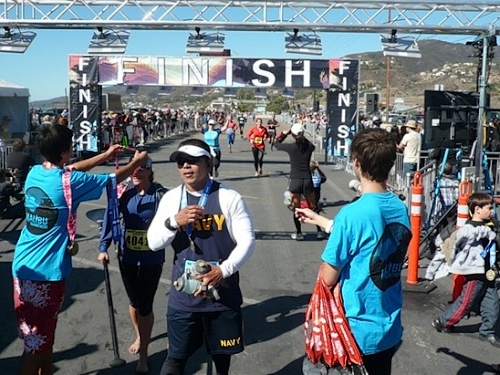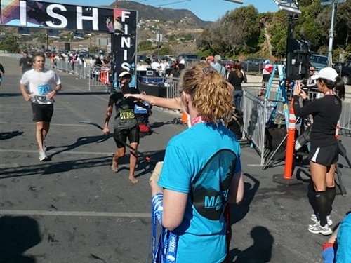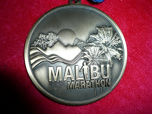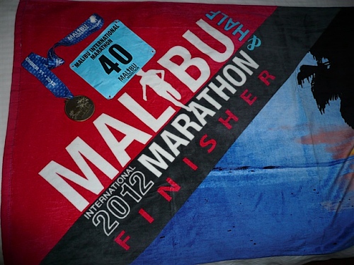 Die letzte Meile bricht an, eine letzte Steigung hinauf und wieder herunter, dann tut sich vor uns der herrliche, lange Strand Zuma Beach auf, gleich haben wir es geschafft. Hier wurde übrigens die Fernsehserie „Bay Watch“ gedreht. Wer erinnert sich nicht an David Hasselhoff und die schönen großen – Augen von Pamela Anderson? Rechts, links auf den Parkplatz und wieder einmal mache ich einen Zieleinlauf, wie ich ihn im ferneren Ausland liebe: Die mitgeführte Bundesdienstflagge wird gezückt, mit ausgebreiten Armen über den Kopf gehalten und der Wind sorgt für vollflächige Aufmerksamkeit. Ich liebe das und die Amis sowieso, sie jubeln mir zu. Dann versüßt das Wort „Finish“ den Tag. Eine tolle Medaille gibt’s und, noch schöner, ein Finisher-Strandlaken, das daheim jede Menge Aufmerksamkeit garantiert. Mit meinen 3:58 Std. ungerade bin ich am Ende tatsächlich 173. von 658 insgesamt und 6. von 35 in der M50, wow. Das sind echte amerikanische Marathonverhältnisse, der Median liegt bei knappen 4:30 Std… Im Ziel gibt es noch viererlei verschiedene Riegel, drei Sorten Dosenobst, kleingeschnitten in Quarkbechergröße und Wasser, das auch jetzt noch geht. Nachdem ich abschließend ein paar tolle Surfmädels beim barfüßigen Einlauf, Paddel in der Hand, betrachtet habe, hat dieser Marathon sein Ende. Nach dem Duschen im Hotel geht es noch einmal zurück und ein sehr langer Strandspaziergang beschließt diese schöne Veranstaltung.