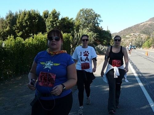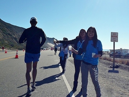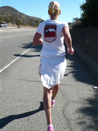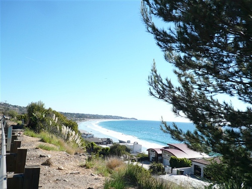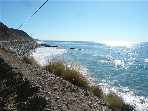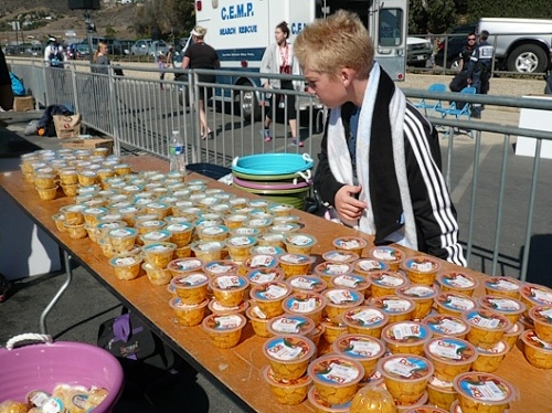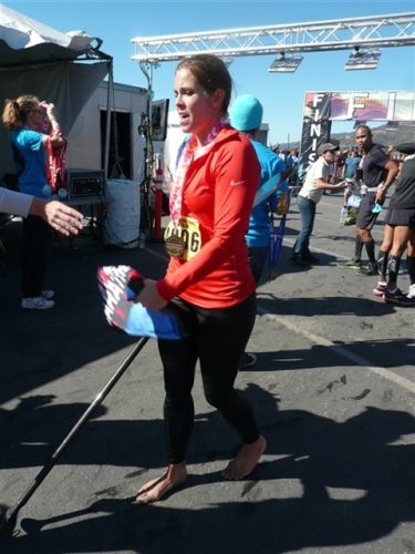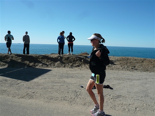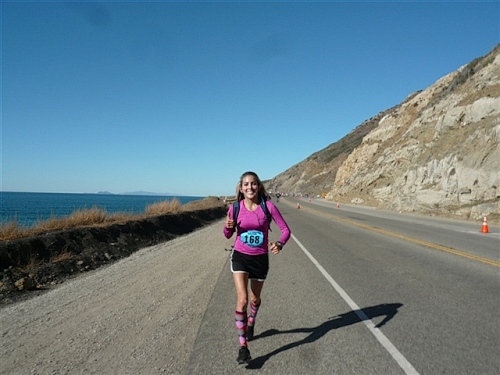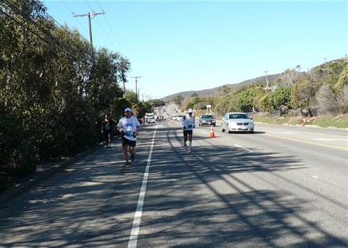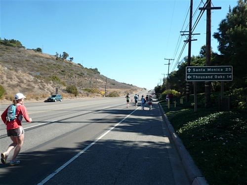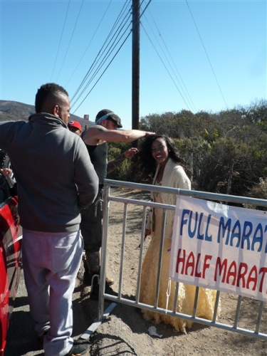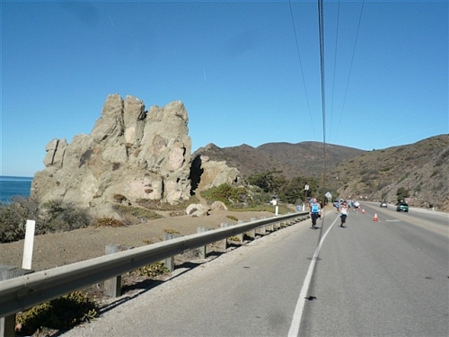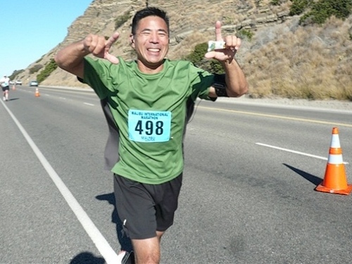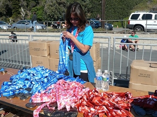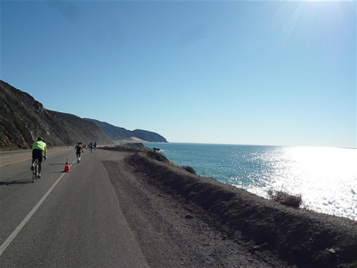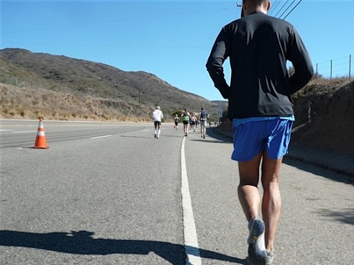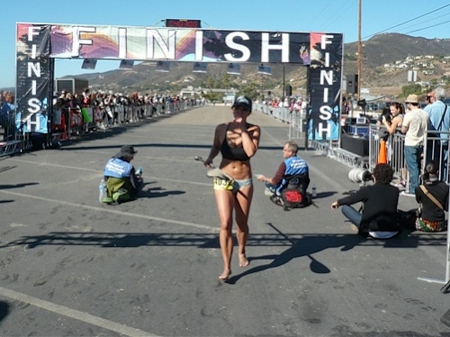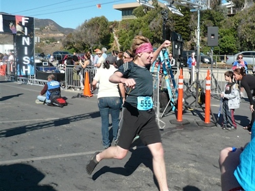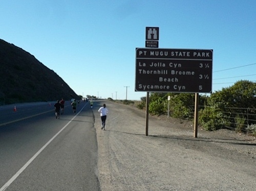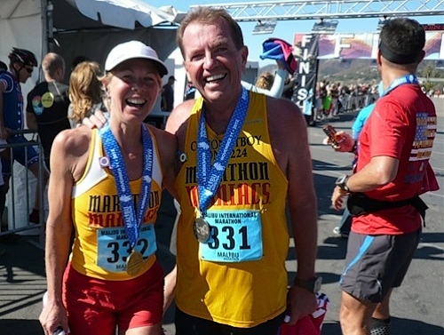 Die letzte Meile bricht an, eine letzte Steigung hinauf und wieder herunter, dann tut sich vor uns der herrliche, lange Strand Zuma Beach auf, gleich haben wir es geschafft. Hier wurde übrigens die Fernsehserie „Bay Watch“ gedreht. Wer erinnert sich nicht an David Hasselhoff und die schönen großen – Augen von Pamela Anderson? Rechts, links auf den Parkplatz und wieder einmal mache ich einen Zieleinlauf, wie ich ihn im ferneren Ausland liebe: Die mitgeführte Bundesdienstflagge wird gezückt, mit ausgebreiten Armen über den Kopf gehalten und der Wind sorgt für vollflächige Aufmerksamkeit. Ich liebe das und die Amis sowieso, sie jubeln mir zu. Dann versüßt das Wort „Finish“ den Tag. Eine tolle Medaille gibt’s und, noch schöner, ein Finisher-Strandlaken, das daheim jede Menge Aufmerksamkeit garantiert. Mit meinen 3:58 Std. ungerade bin ich am Ende tatsächlich 173. von 658 insgesamt und 6. von 35 in der M50, wow. Das sind echte amerikanische Marathonverhältnisse, der Median liegt bei knappen 4:30 Std… Im Ziel gibt es noch viererlei verschiedene Riegel, drei Sorten Dosenobst, kleingeschnitten in Quarkbechergröße und Wasser, das auch jetzt noch geht. Nachdem ich abschließend ein paar tolle Surfmädels beim barfüßigen Einlauf, Paddel in der Hand, betrachtet habe, hat dieser Marathon sein Ende. Nach dem Duschen im Hotel geht es noch einmal zurück und ein sehr langer Strandspaziergang beschließt diese schöne Veranstaltung.