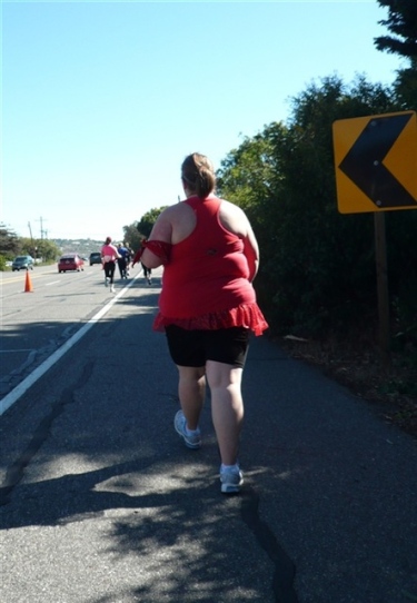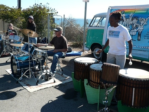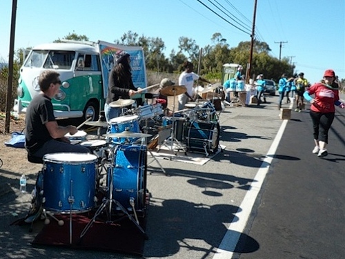 Eine einzige Percussionband spielt kurz vor dem Ende auf. Noch interessanter als ihr Rhythmus ist der uralte VW-Bus, der wohl ihnen gehört, ein echtes Schätzchen. Dann passiert das, mit dem ich auch schon gerechnet habe, man kennt ja seine Pappenheimer: Ich hole tatsächlich einige wohlbeleibte Halbmarathonerinnen ein, die genauso lange wie wir unterwegs sein müssten, also auch zu diesem Zeitpunkt schon rund dreidreiviertel Stunden. Aber ich muß mich selbst am Riemen reißen, lästern tut es sich ja schnell. Wer sich mit so viel Übergewicht 21,1 km am Stück bewegt, hat wirklich Respekt verdient.