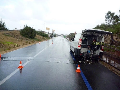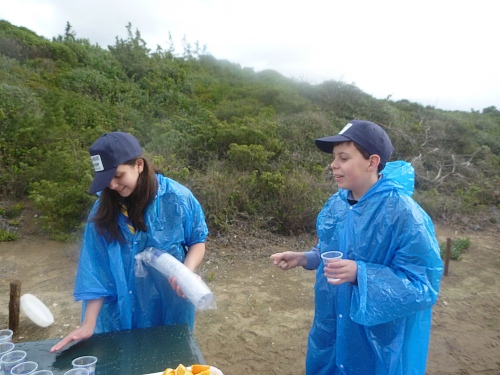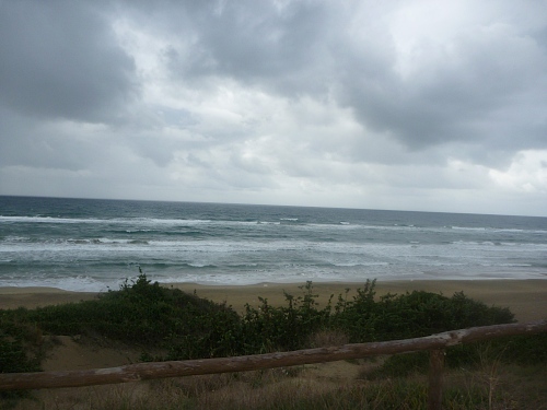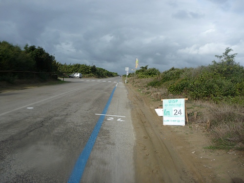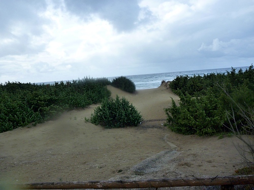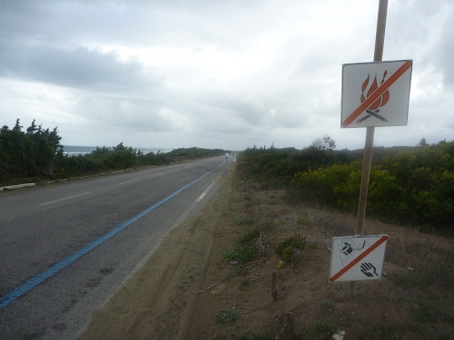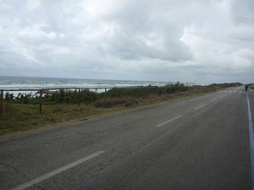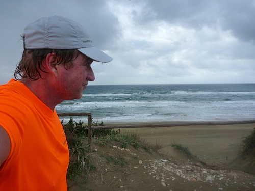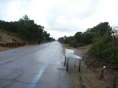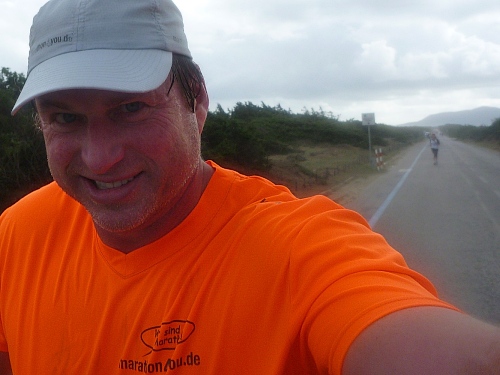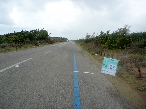 Dann über eine Stunde schnurgeradeaus auf der Düne entlang. Das ist der Wahnsinn. Noch mehr DNF-Läufer kommen mir entgegen, der „Recupero-Atleti-Wagen“ fetzt im Höllentempo hin und her, als sei Rückzug von El Alamain. Sonst ist da nix, außer Wacholder und Meeresgischt. Der Blick geht 3, 4 Kilometer weit zum Horizont, der immer einen leichten Anstieg suggeriert, oder auch hat. Die bunten Läufer vermischen sich im salzigen Dunst, Regenschauern, Sonnenschein, dann gehts weiter, 3, 4 Kilometer. Und immer weiter, der Horizont ist unendlich. Die Augen, das Hirn und der Magen flimmern, gaukeln baldiges Ziel vor. Und nochmals 3,4 Kilometer und nochmals 3, 4 Kilometer. Aber absolut scharfes Erlebnis! Laufglück pur in einer unendlichen Perspektive.