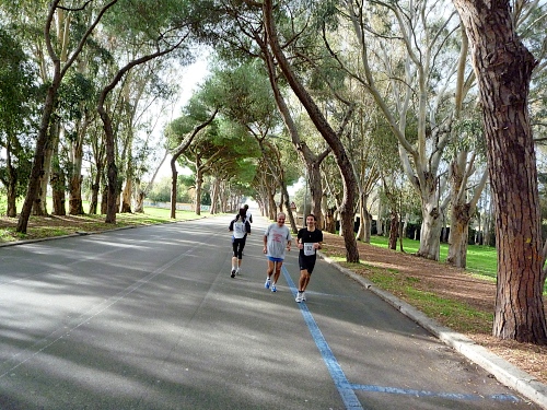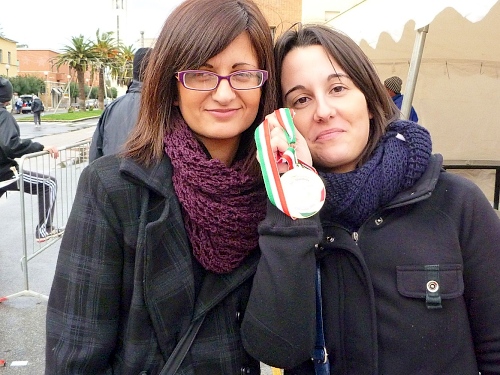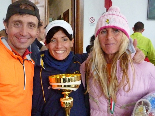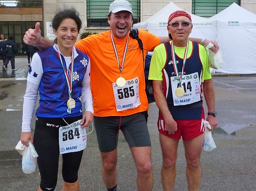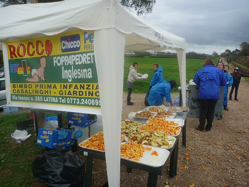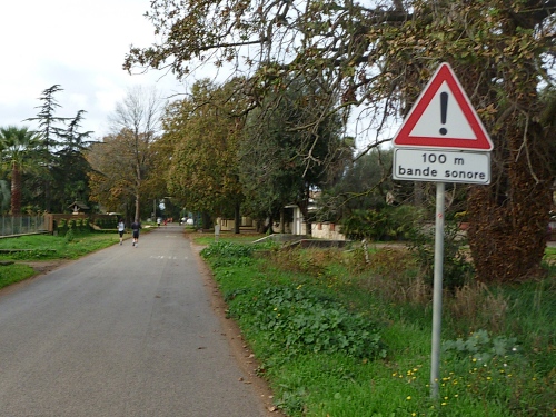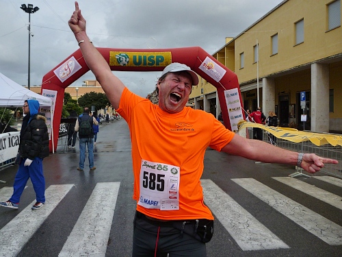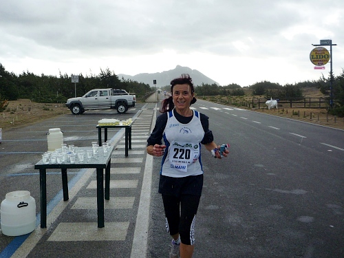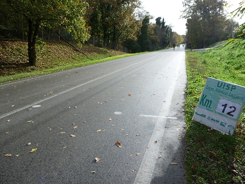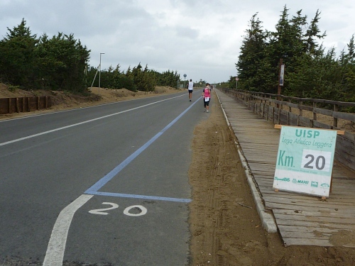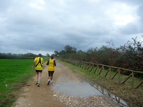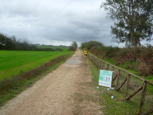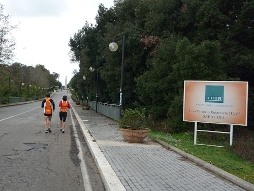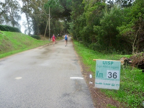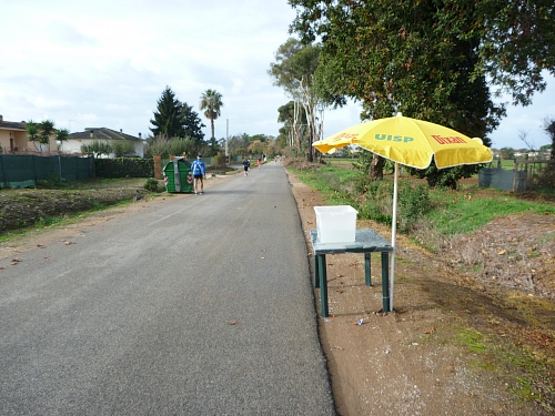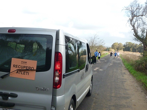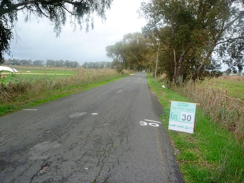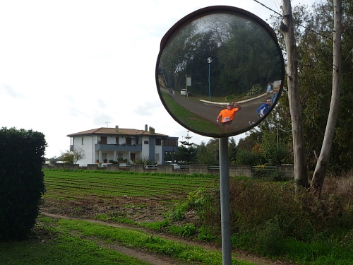 Bei km 9, vor dem Lago di Caprolace, biegen wir in die landwirtschaflich dominierte Ebene ein. Der Besenwagen (Recupero Atleti) überholt mich. Auf den plastiküberzogenen Sitzen die ersten DNF-Läufer . Ich bitte ein Pärchen, ein Foto von mir zu schießen. Maria rudert für Italien 1. Witzig, so ein Zufall, ich bin Deutschland 1, bin gut, sie und das Foto auch, nur dieser Paparazzi...., egal, er schiesst das Foto, ist nett.