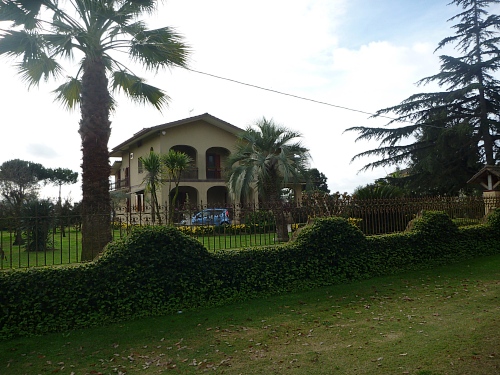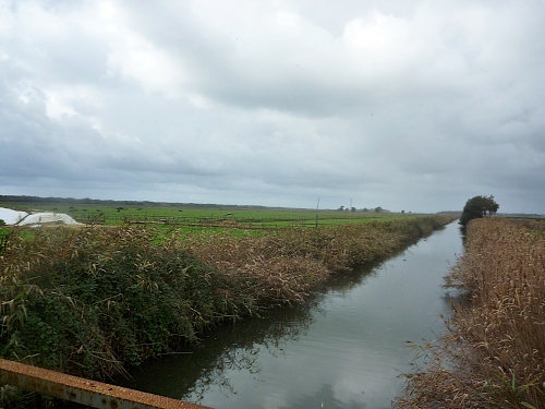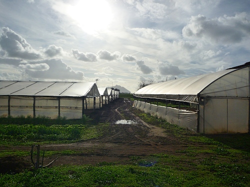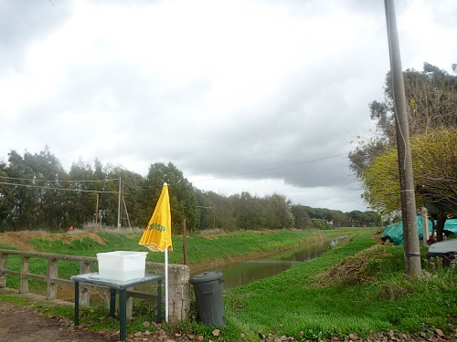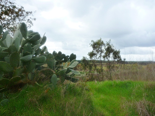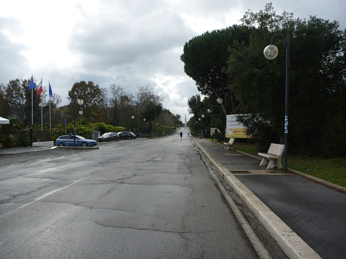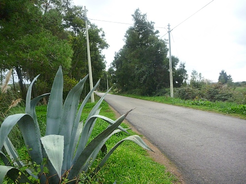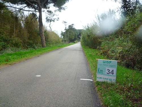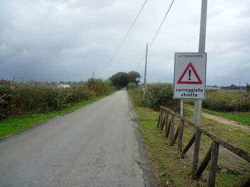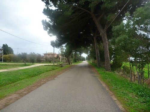 Abgesehen von Berlusconi und Angela lebt man hier vom Gemüse- und Blumenanbau. Kilometerlange Rosen-, Ruccola- und Baumschul-Felder, dazwischen Gewächshäuser. Links jetzt der mit Stacheldraht abgeschirmte Staatsforst des Nationalparks, früher ein sumpfiger Seuchenherd, nun UNESCO-Erbe. Korkeichen, Steineichen und Zwergfächerpalmen, darin Wildschweine, Hirsche und sonstige Weihnachtsbraten. Immer mehr Geher, einsame Schwammstationen vor kilometerlangen Geraden. Oh wie ist das schön!