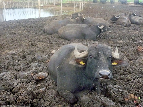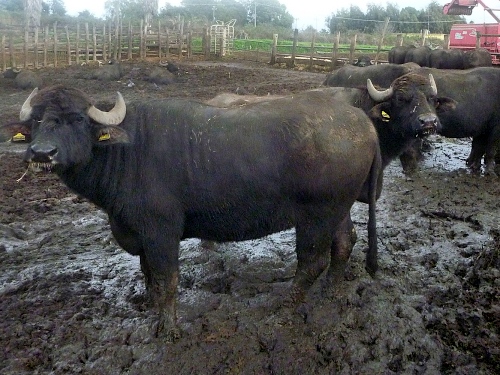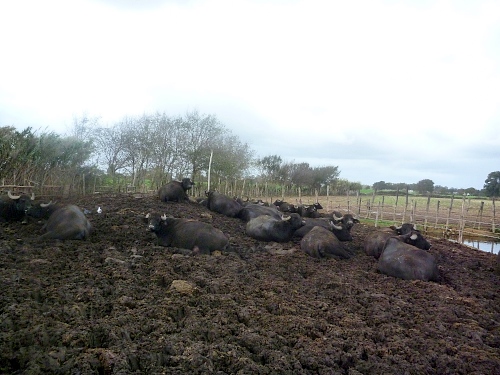 Bei km 30 rechts ab, auf so einen bescheuerten, aber absolut göttlich-urig-krassen Feldweg. Schwere, schwarze Tiere im tiefen Schlamm des afrikanischen Wasserlochs, die die Basis für den Büffelmozarella liefern. Die, die nicht erwähnt wird, hat die Riesen nicht gesehen, weil sie wenige Minuten hinter mir in einem ungeheuerlichen Regenguss die scharzen Masse vor dem Schlamm des Sumpfes nicht ausfindig machen konnte. Ich dagegen mache zahlreiche Fotos der urigen Tiere „ Jenseits von Afrika“, ich bin Klaus Maria Brandauer, ausnahmsweise ohne Syphilis. Es ist ja sowas von geil, so unglaublich, so schön, so wortlos atemberaubend, ein Film jenseits aller Vorstellungskraft, und ich bin der Regisseur. Fehlen nur noch die Massaikrieger, die wippend in der Ebene am Horizont erscheinen, oder die deutschen Soldaten des Lettow von Vorbeck. Nie besiegt, nie kapituliert, so wie ich, auf dem Weg in die ewigen Ebenen, ein Marathonläufer im Traum der unsterblichen Ebenen.
