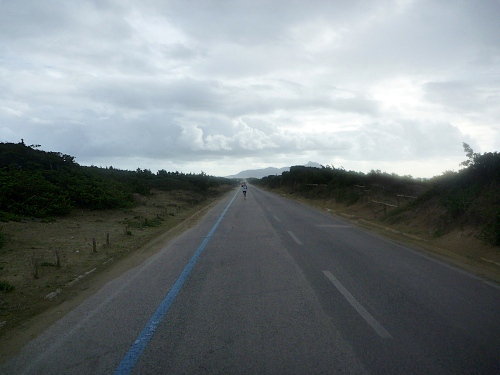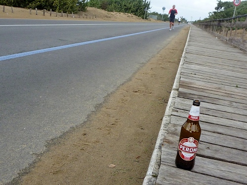 Marathon heisst Geduld. Hier steht keine Sambaband, kein Zuschauer, kein Cheer-Leader-Mädchen. Auch für mich ist das neu: Laufen bis zum Horizont und dann weiter und dann noch weiter. Du registrierst in dem ewigen Küstendunst, wie lang ein Marathon ist, läufst mitten auf der Strasse, einsam und allein mit deinen Gedanken, spulst Kilometer um Kilometer ab und denkst, du kommst nie an. Links das tosend-weisse Meer, rechts die traumhafte Lagunenlandschaft mit weissen und bunten Vögeln. Es ist ein unvergessliches Erlebnis, ein Traum jenseits von Afrika, nie erlebtes Laufgefühl. Ewig geradeaus, frei und sauber laufend, ewig in Trance und absolut frei.