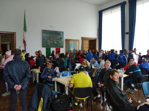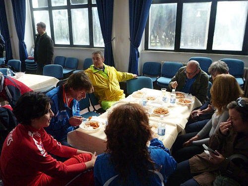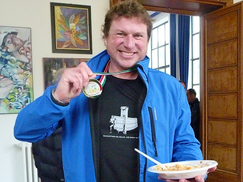 Schnell Pasta und Weisswein im warmen Donimino del Comune, oder wie das Ding genannt wird, wo sich schwitzende Gockel im Finisherrausch präsentieren. Immerhin beträgt der Streckenrekord 2:15, alle Achtung! Aller Respekt!