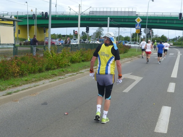 Auf der öden Schnellstraße zieht Judith vorbei, nicht ohne mir ein „Jak tam?“ (Wie geht’s?) zuzurufen. Dank Steffen Möller wissen wir: Der Pole würde nun nie und nimmer zugeben, dass es ihm gut geht. Die einzig richtige Antwort ist – mit traurigem Gesicht – ein „Stara bieda“ (wörtlich: „die alte Armut“, sinngemäß: „besch... wäre geprahlt“). Nun gut. Judith zieht vorbei, aber nicht so schnell wie letztes Jahr. Ich beobachte die Läufer vor dem Besenwagen auf der Gegenseite und bleibe an ihr dran.