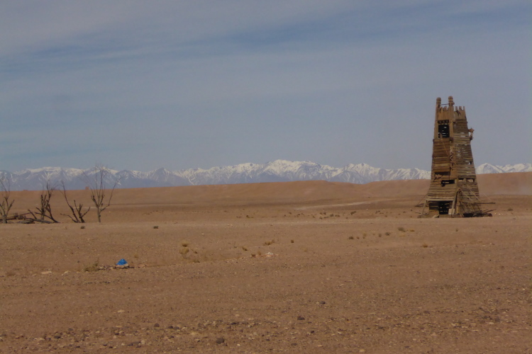 Der Anblick der Läuferkarawane vor den schneebedeckten Bergen des Hohen Altas ist aber prachtvoll. In einer Senke ist eine alte Goldmine, der Schacht ist jetzt bedeckt. Wenn gesucht wird, steht ein Polizist daneben. Die Bruchbude ist eingefallen, man hat sich auf eine andere Suche begeben: Wir laufen gerade durch das 16 km lange, 4,5 km breite Streufeld des Tamdakht Meterorit, der hier 2008 niederging. Augenzeugen berichteten von Donnergrollen, Schockwellen und Explosionen, die Erde soll gebebt haben. Der Feuerball wurde in ganz Marokko gesehen, es soll taghell gewesen sein. Das größte Fragment des Meterorit war 30 kg schwer.