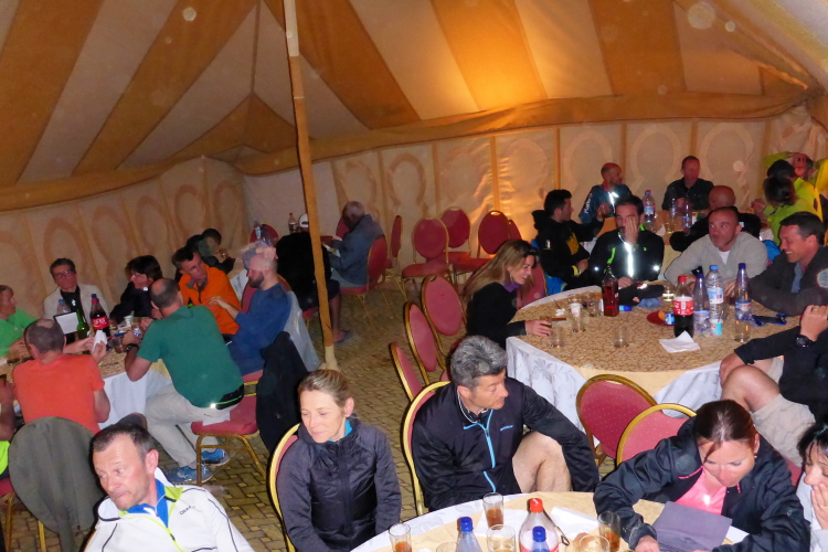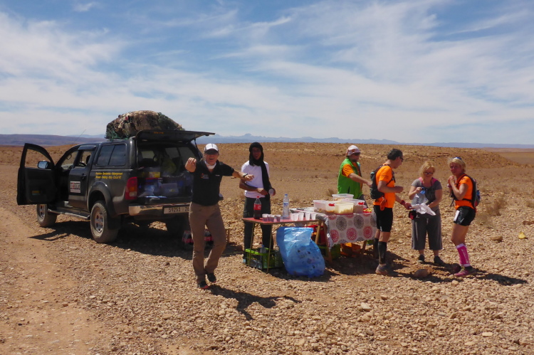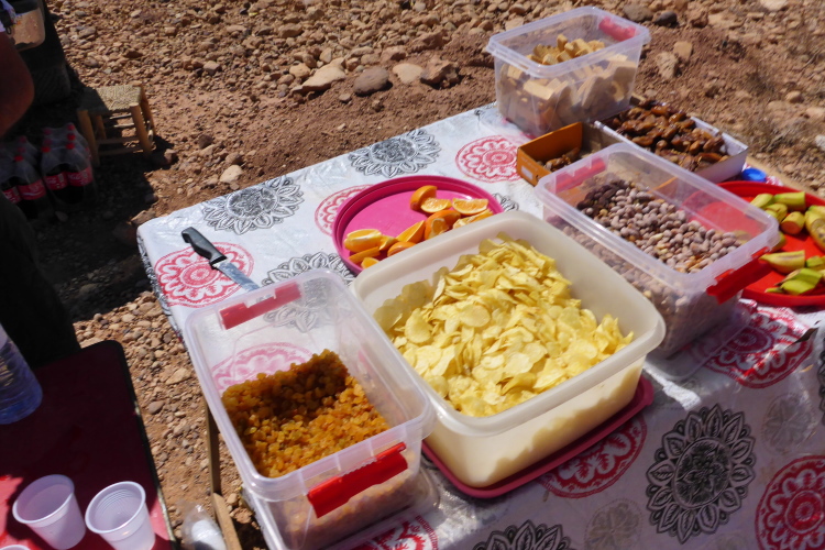 Der Trail wird mit Halbpension angeboten. Nach dem Lauf gibt es ein Lunchpacket mit Cola, Soda- und stillem Wasser, Tee, Kaffee, Orangen, Nüsse, Datteln. Meinen Thunfischvorrat brauche ich nicht, ich bin sehr zufrieden.