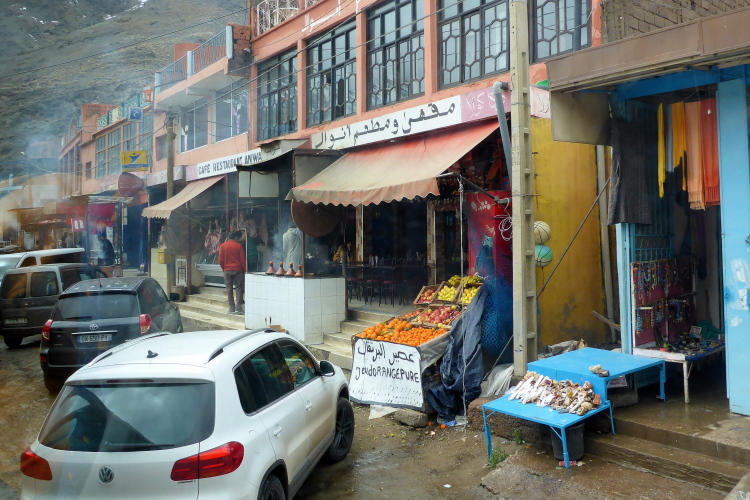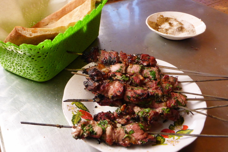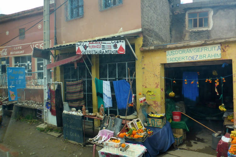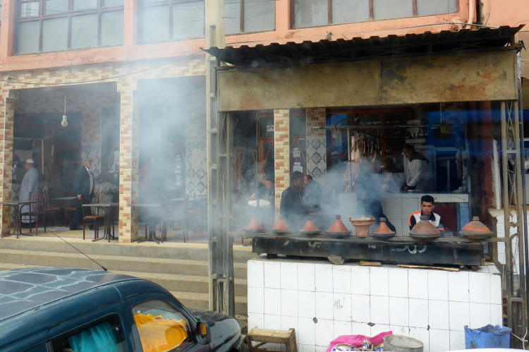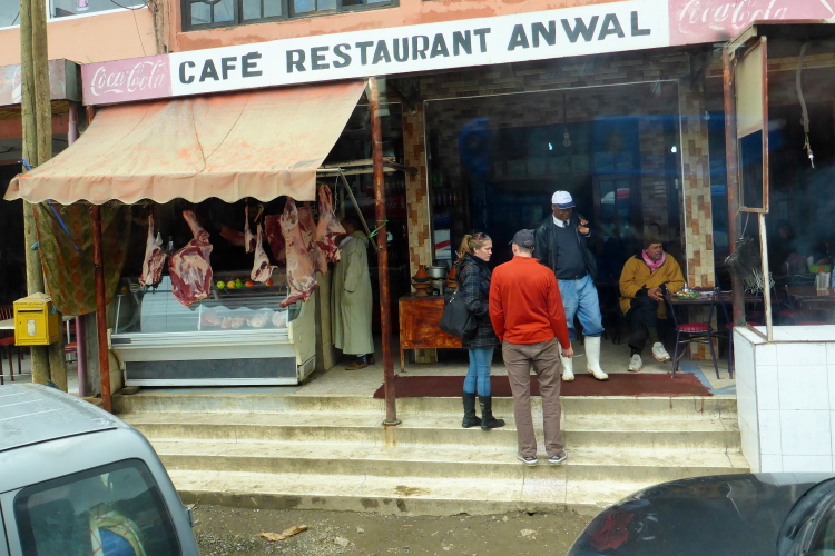 In Agouim endlich Pause. Frank hat mit den Nahrungsmitteln der letzten Nacht zu kämpfen, ich bestelle mir passenderweise Leberspieße. Habe ich jemals in meinen Berichten über Essen geredet? Hier ist es angebracht: Die Rinderleber wird mit Rinderspeck und Koriander gegrillt. Man muss schnell sein. Zuerst zum Metzger, der die Rinderhälften an der Strasse aufgehängt hat, dann mit den Spießen zum Griller, der in einer kräftigen Rauchwolke lebt. Und schon mahnt der Busfahrer zur Weiterfahrt.