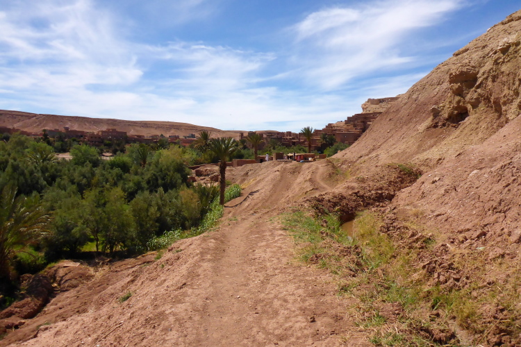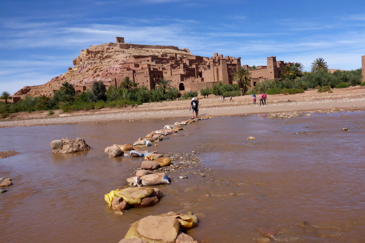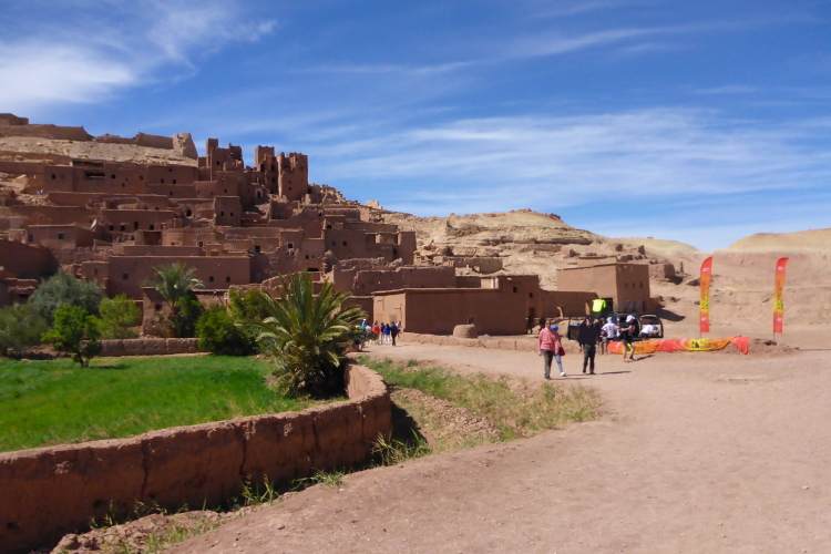 Die Tizgui-Wüste wird vom Fluß Asif Mellah begrenzt, an dessem Steilufer nun der Lauf entlanggeht. Immer wieder kreuzen wir kleine grüne Bewässerungskanäle, in denen das glasklare Wasser glitzert. Dann ist schon Ait Ben Haddou sichtbar. Die befestigte Stadt (Ksar) der Sippe des Ben Haddou ist seit 1987 Weltkulturerbe. Obwohl es seit 2 Jahren eine befestigte Strasse gibt, verirren sich nur wenige Touristen hierher. 15 Filme wurden zwischen den Lehmmauern der Altstadt gedreht, der jüngste ist „Game of Thrones“. Die am Ufer stehenden überdimensionierten Stadttore sind Styroporrelikte aus dem Film. Der Rest stammt theoretisch aus dem 11. Jahhundert. Man muss Lehmbauten immer wieder ausbessern.