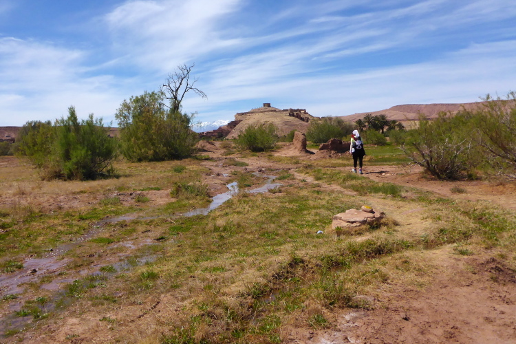 So kurz der Lauf auch ist, wir sind ziemlich erschöpft. Bis zum Camp wären es etwa 4 Kilometer, aber Richard will nicht, dass wir entlang der Strasse laufen. Wir haben schließlich Osterurlaub. Die 4x4 Wagen stehen drüben auf der anderen Seite. Es gibt glücklicherweise noch keine Brücke über den Asif Mellah, so hüpfen wir über Sandsäcke und dann entlang der gelangweilten Souvenirhändler zum zentralen Platz. Jeder entscheidet selbst, wann er sich ins