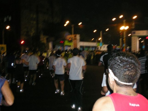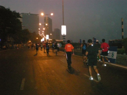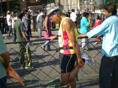 Wir gehen zu den Startschleusen und pünktlich um 6.40 Uhr gibt es den Startschuss. Mit lautem Gejohle und der Anfeuerung der vielen Zuschauer geht es auf die Strecke. Leider muss ich schon nach 6 Km aufgeben. Ich habe Schmerzen im vor ca. 5 Wochen operierten Fuß, den ich mir auch noch verdreht habe, als ich gestern im dichten Straßenverkehr von Mumbai einem PKW geschwind ausweichen musste.