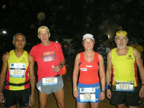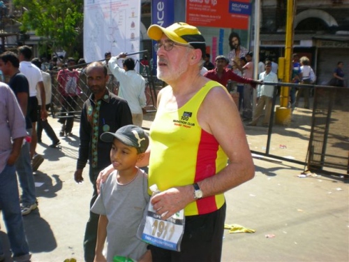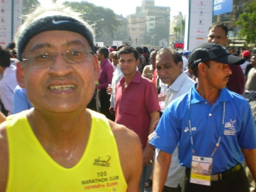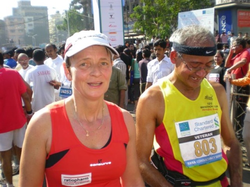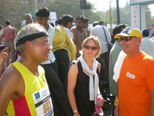 Dann deutsche Worte aus dem Hintergrund: “Hallo Mike“, mein indischer Lauffreund Hiren vom 100 MC, der zwar in Hamburg lebt, aber alle 7 Marathonläufe in Mumbai mitgemacht hat, ist natürlich auch wieder da. Im Schlepptau hat er Clubkamerad Günter Heyer. Der 71jährige traut sich was! Weitere deutsche Teilnehmer gesellen sich zu uns und so werden die typischen Fragen gestellt: Wo wird demnächst gelaufen, wie schnell, usw. .