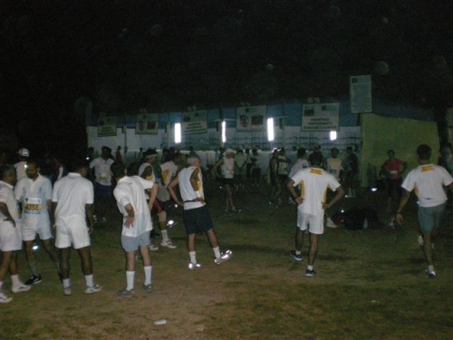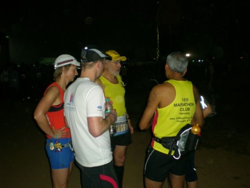 Schon weit vor dem Startplatz wird man von einen der vielen freundlichen, jungen Helfern im perfekten Englisch mit der Frage, ob man behilflich sein darf, in Empfang genommen. Man wird auf ein riesiges Gelände, das sonst der Sportart Nr. 1, dem Kricket dient, geführt. Deutliche Beschriftungen und Scheinwerferlicht machen trotz Dunkelheit die Orientierung leicht und man findet die Zelte und Hütten des Medical- und Massage-Center und die Kleiderabgabe ohne Probleme. Von einer großen Musikbühne ertönen europäische Klänge.