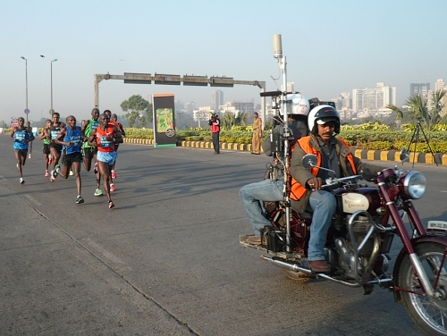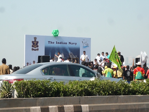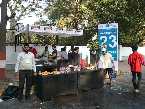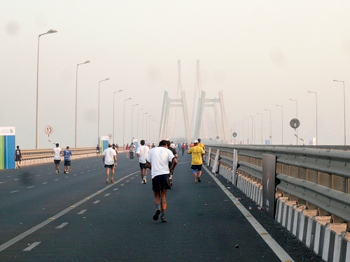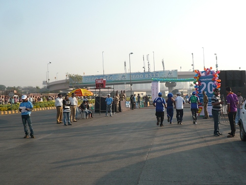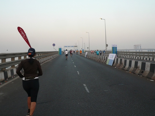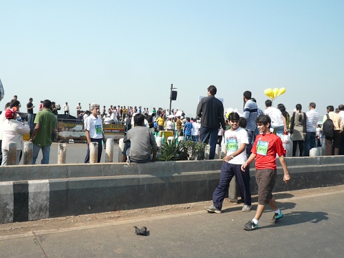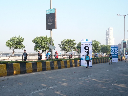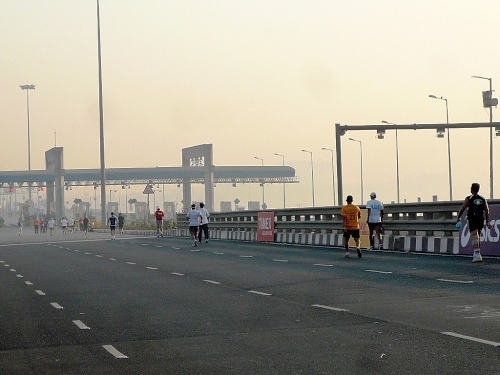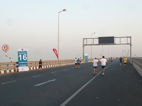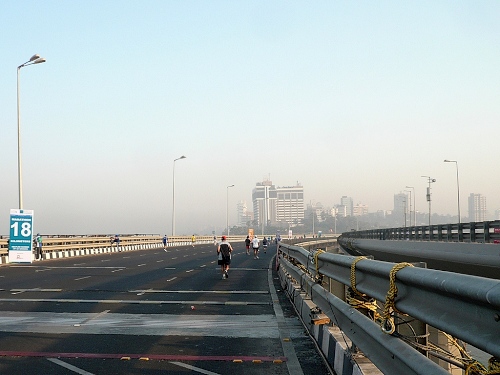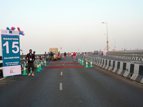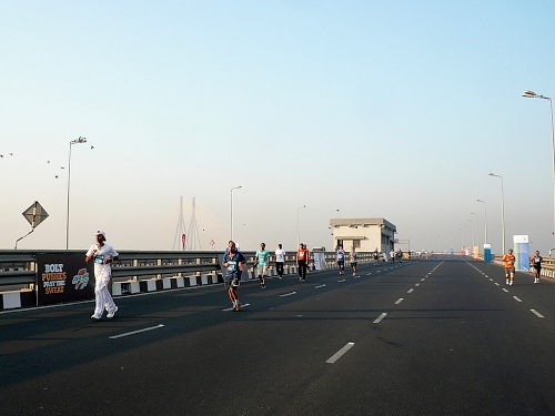 Der Lauf über den Bandra-Worli Sea Link ist einfach einzigartig. Kilometerlang rechts die Mahim Bay mit der Stadtkulisse und den Bergen dahinter und links das offene Meer. Einfach wunderschön. In diesem Jahr sind auf der Brücke sogar am Anfang und Ende Wasserstationen aufgebaut, die heute für jeden Teilnehmer sehr hilfreich sind.