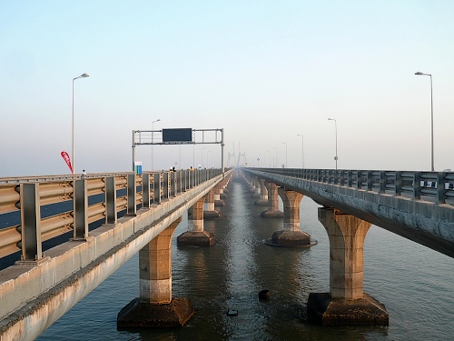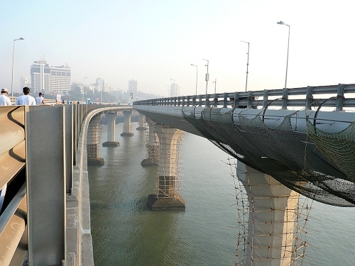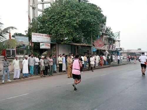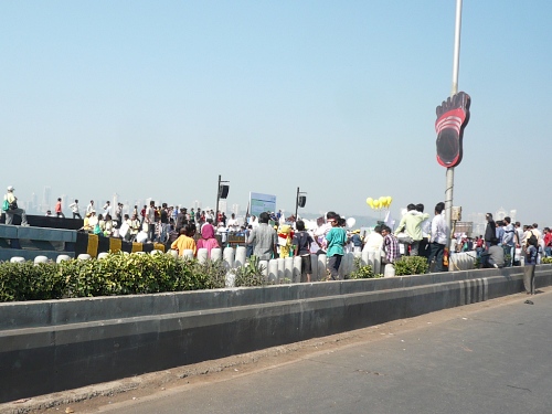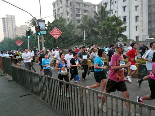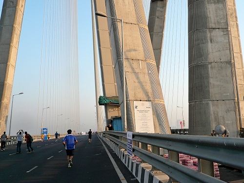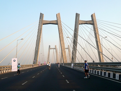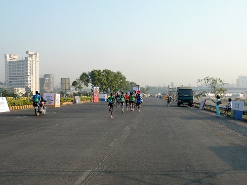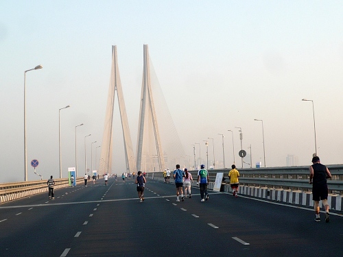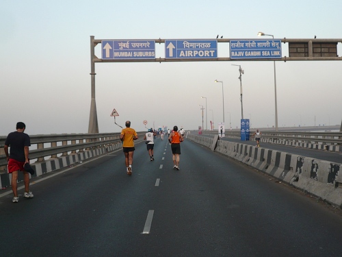 Weiter geht es vorbei an kleineren Slums, am Mahalaxmi Race Course - der Pferderennbahn in Richtung Sealink. Hier kommt jetzt das große Feld der Halbmarathonis auf der anderen Straßenseite entgegen. Wir laufen über die 5,6km lange Brücke nach Bandra.